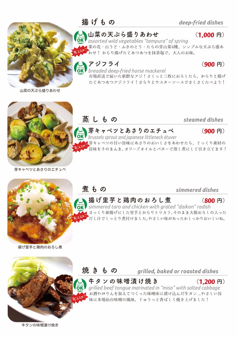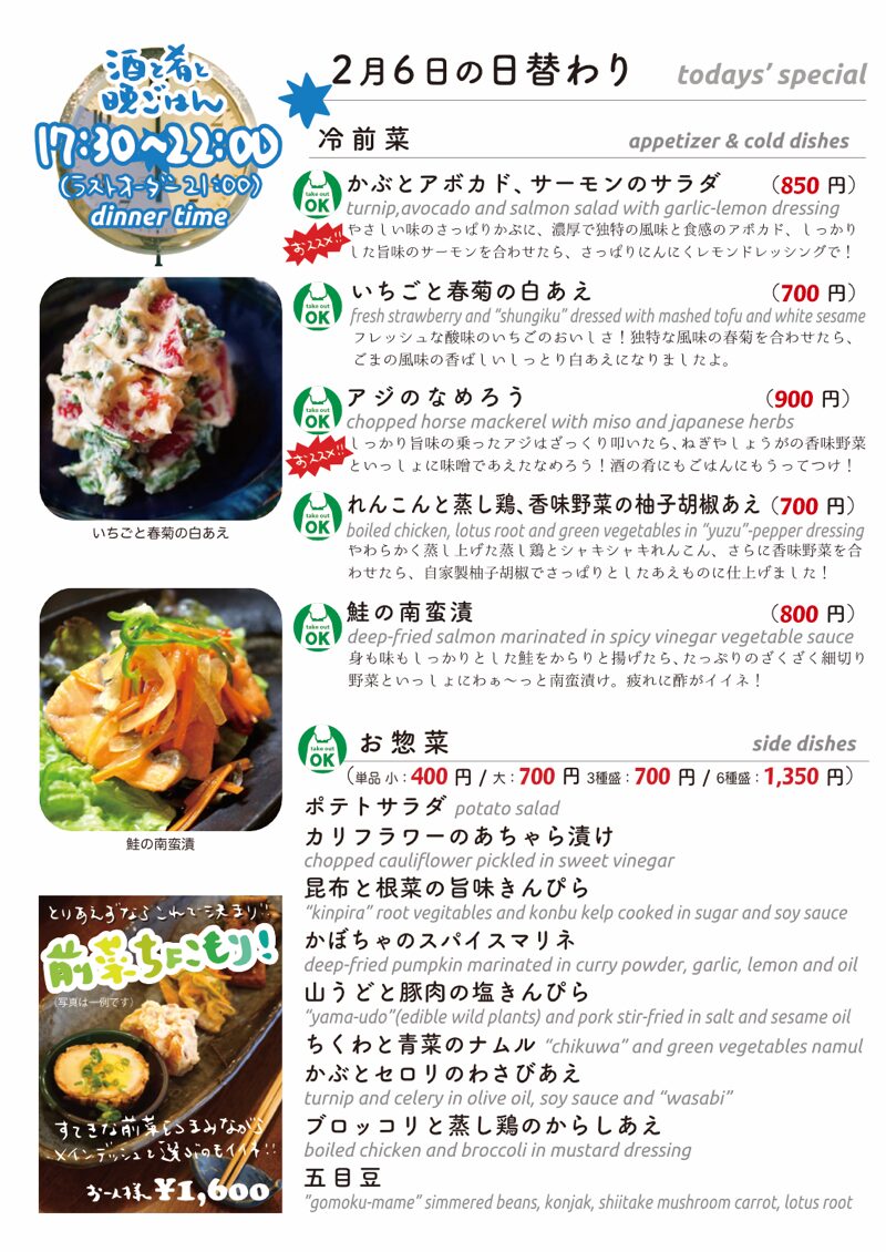 今夜もおいしいごはんは日替わりに、もちろんお持ち帰りも!