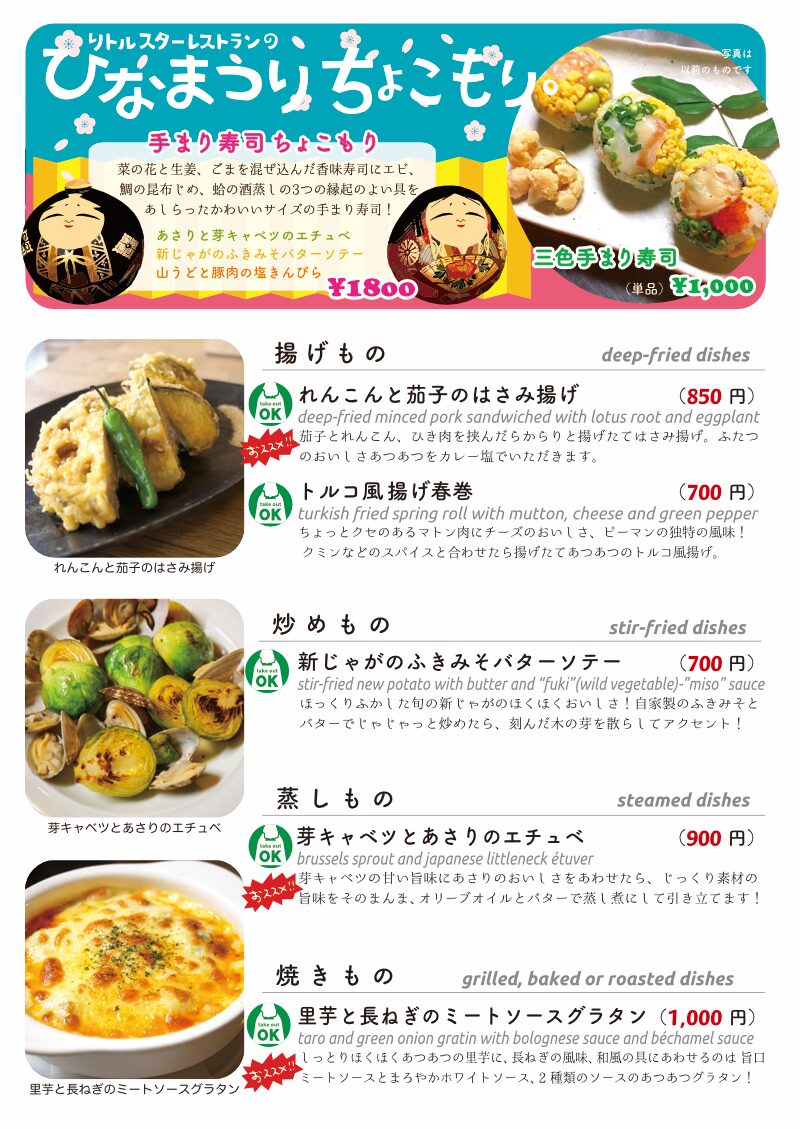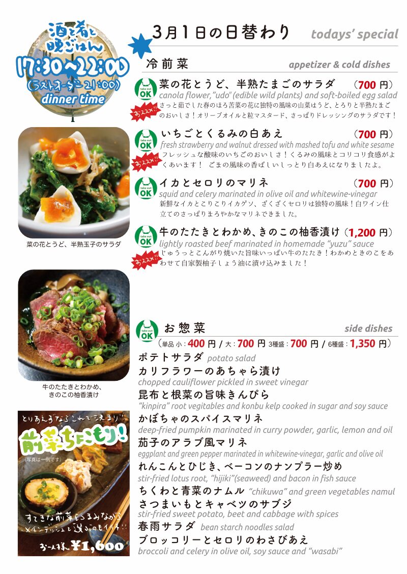 いやいやホントの春が来た!?…ってくらいの正真正銘の春日和〜って思っちゃうよな、はじまったばかりの弥生3月年度末!(笑)あぁ、来週スンゲー寒の戻りが来るらしいけど…当店的にはちょうどそこアレだ!小さな春休みだ!(なので寒よ戻ってこないで〜…)とか思いつつ、今週末は当店ちょっと前倒しの桃の節句よ!と土曜日の夜!…あー午後にSNSでお席埋まりはじめましたヨ〜なんてお知らせもしましたが、さてと当店只今ご案内出来るお席は…って書いたところで、もう店内収拾つかないくらいの大忙しで…結局ブログを書くの断念だったです土曜日の夜…いや、申し訳ない。