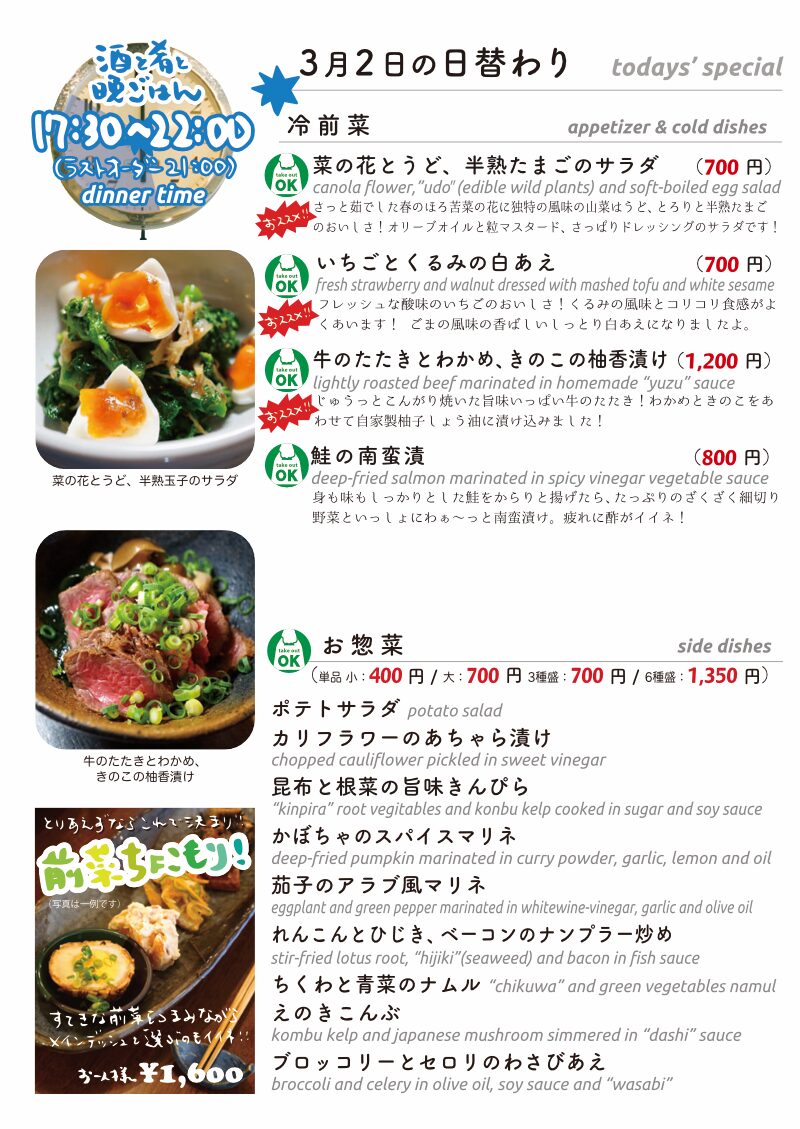 今夜もおいしいごはんは日替わりに、もちろんお持ち帰りも!