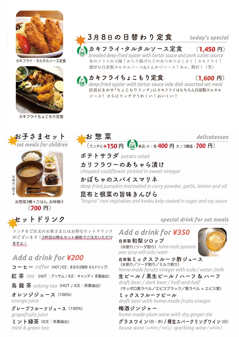 いやこりゃまた寒い!サムサムですよ!!と東京三鷹は今週の寒の戻りもここに極まれり的お天気空模様で週末土曜日お昼時…いや、お客さんは来るんかいな?と思いきやランチ開店10分待たずに(アリガトウゴザイマス)…今日のお昼ごはんにお持ち帰り日替わりですよ。