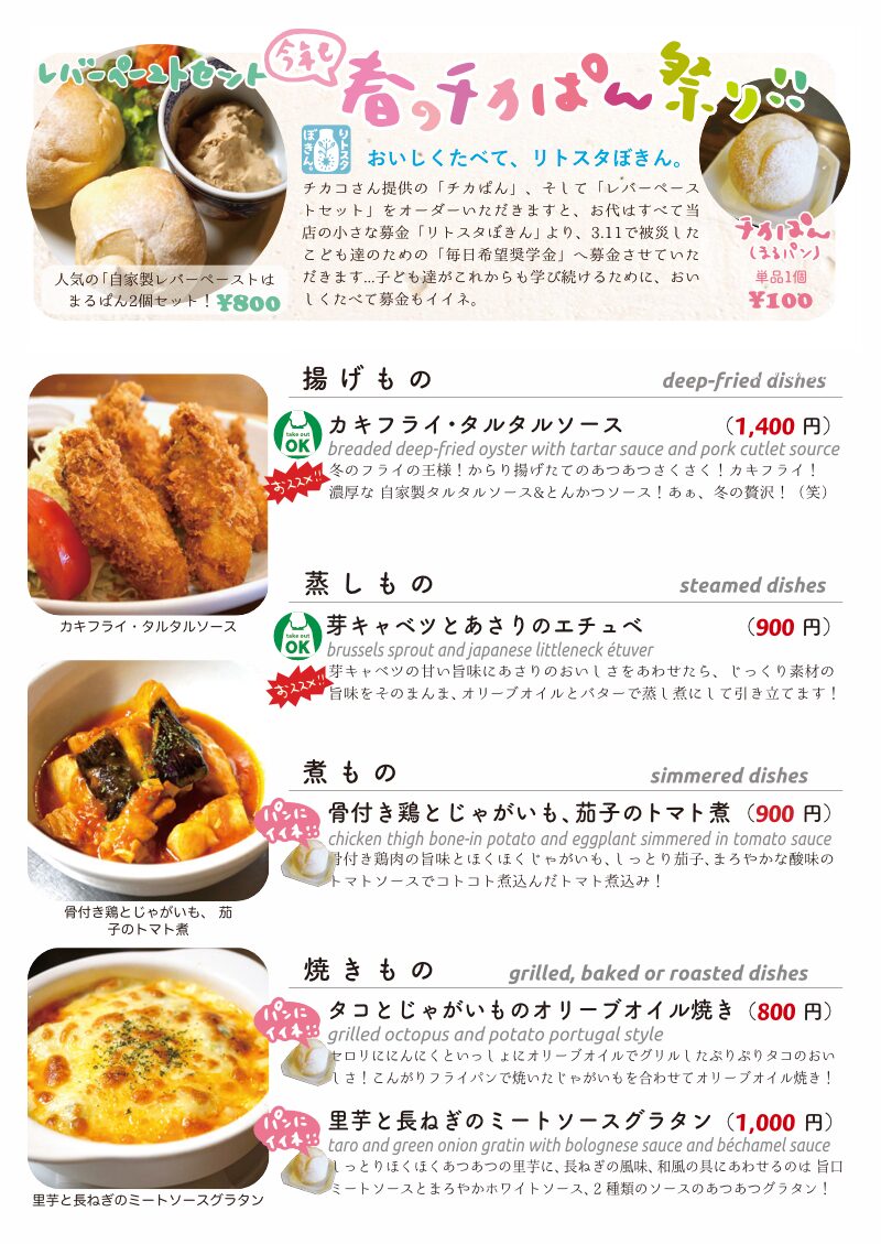 そして当店今夜の混雑状況ですが、昨日とは打って変わってのんびりスタート日曜日の夜(笑)…まだまだお席に余裕がありますので、そうですね、特に今日お出かけされたみなさんは、ぜひ帰りにちらりとリトスタ寄ってごはんをたべてこの週末を締めくくるってのもいいと思いますよ!(笑)…って、もしよかったら毎年恒例は「春のチカぱん祭り」!のセットメニューは「チカぱんレバーペーストセット」もぜひぜひご注文下さいね!