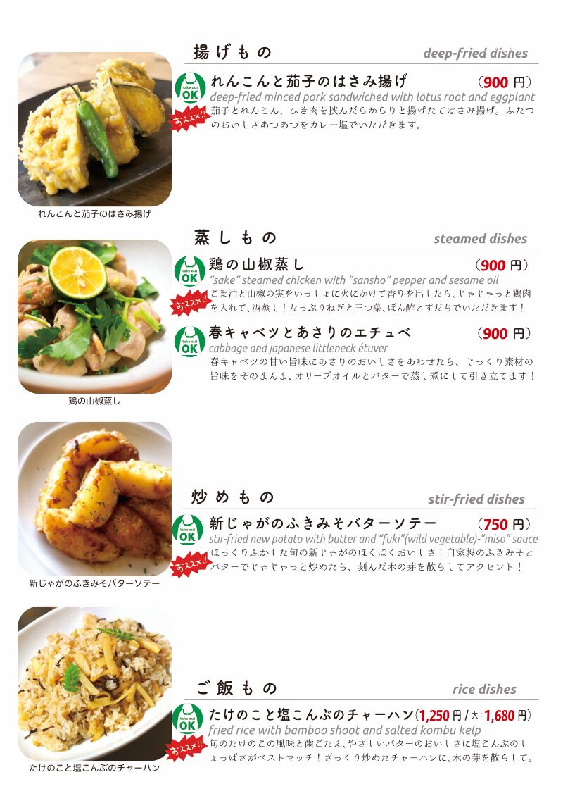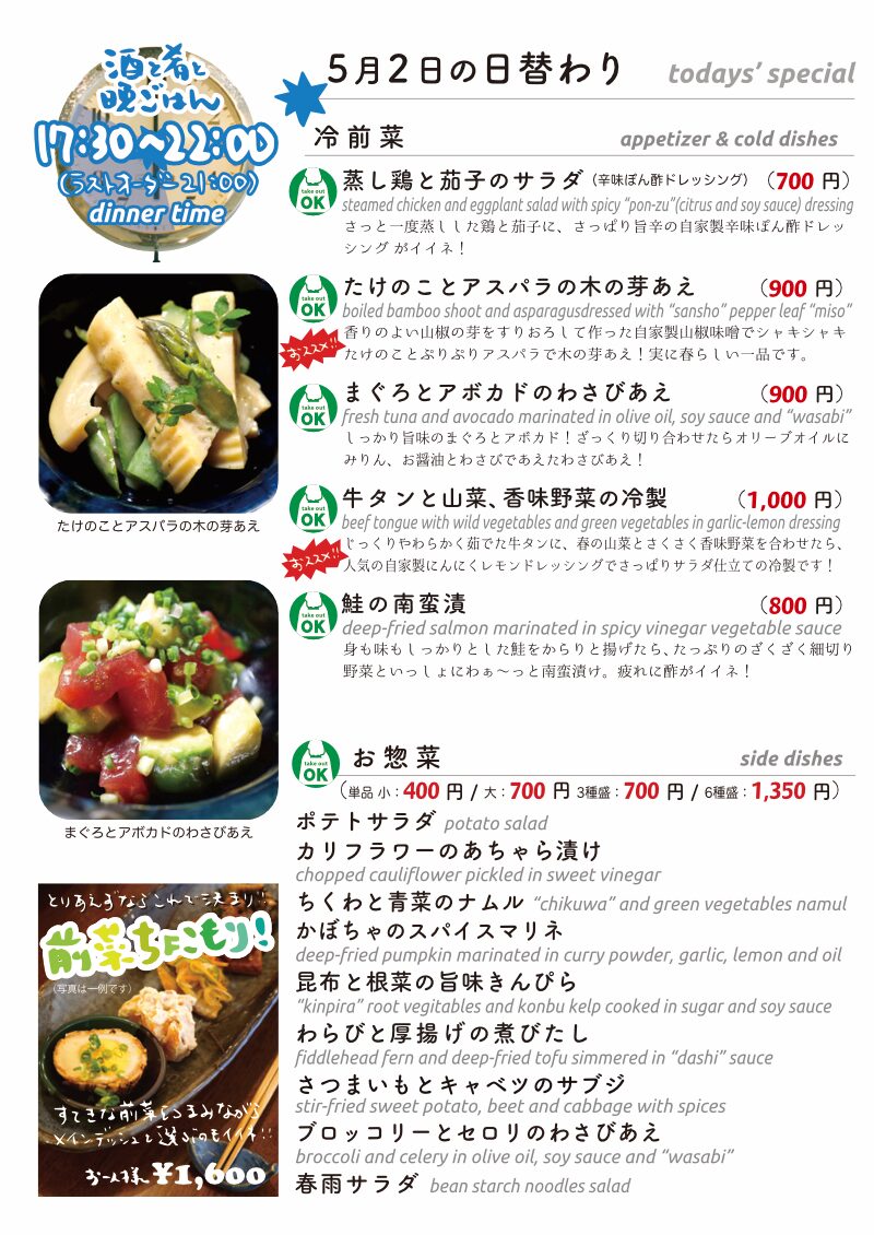 今夜もおいしいごはんは日替わりに、もちろんお持ち帰りも!