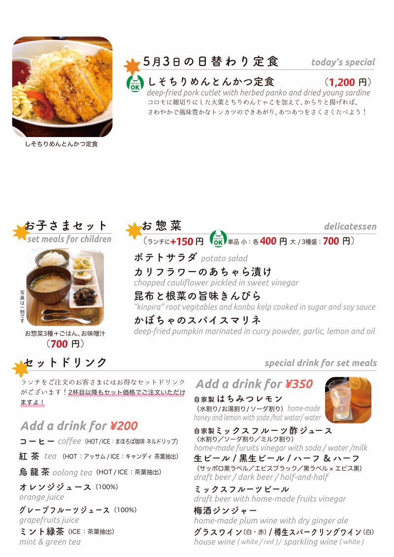 わー!イイオテンキデスネ〜と東京三鷹はGW後半戦4連休スタートですよと、カレンダー通りのみなさんはここからがGW本番!って、いやだから街は静かなんでしょうねぇと東京三鷹は憲法記念日の祝日土曜日お昼時(笑)今日のお昼ごはんにお持ち帰り日替わりですよ。