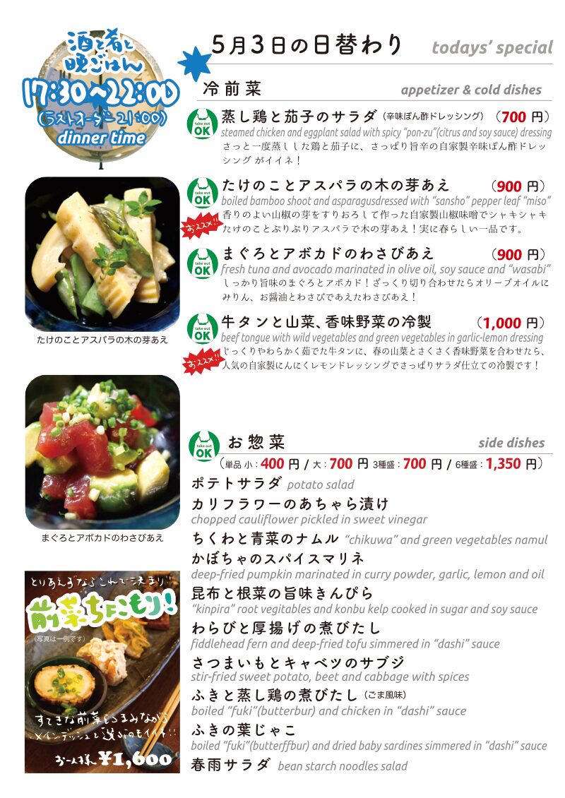 いやいや東京三鷹は気持ちのいい初夏の陽気でGW後半戦4連休初日!憲法記念日の祝日土曜日の夜を迎えておりますが、当店今夜の夜営業は17:30ありがたいことに満席スタートからの…只今19時過ぎ、そろそろお席が空いてくる頃?と、今現在ご案内出来るお席は