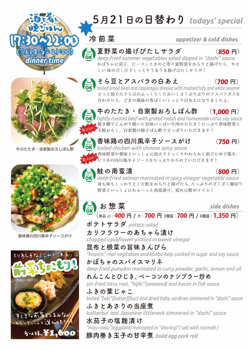 今夜もおいしいごはんは日替わりに、もちろんお持ち帰りも!