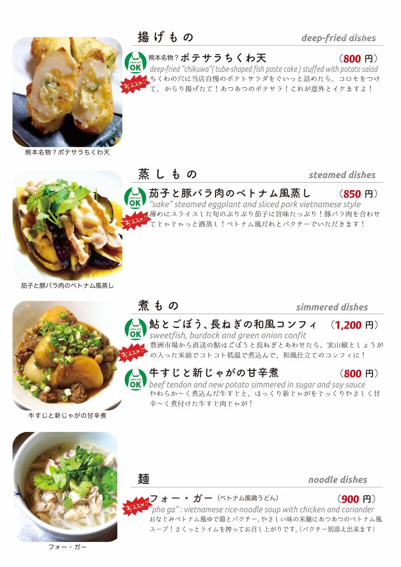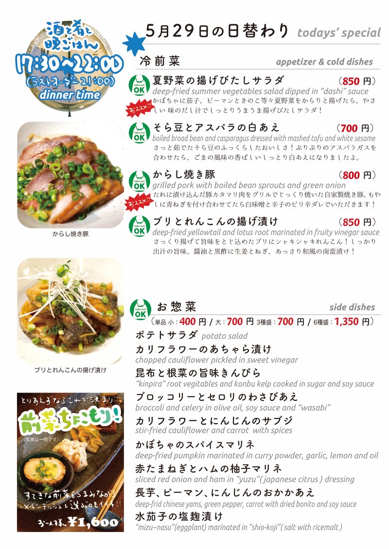 今夜もおいしいごはんは日替わりに、もちろんお持ち帰りも!