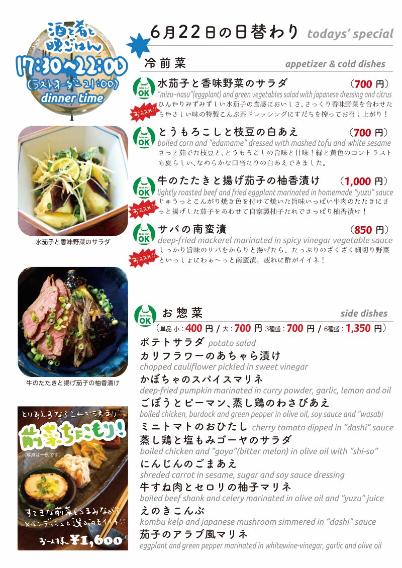 今夜もおいしいごはんは日替わりに、もちろんお持ち帰りも!