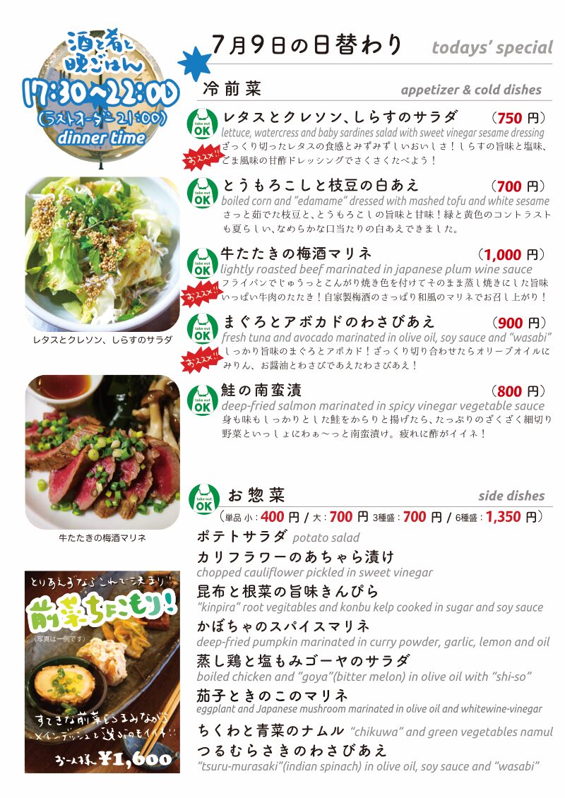 今夜もおいしいごはんは日替わりに、もちろんお持ち帰りも!