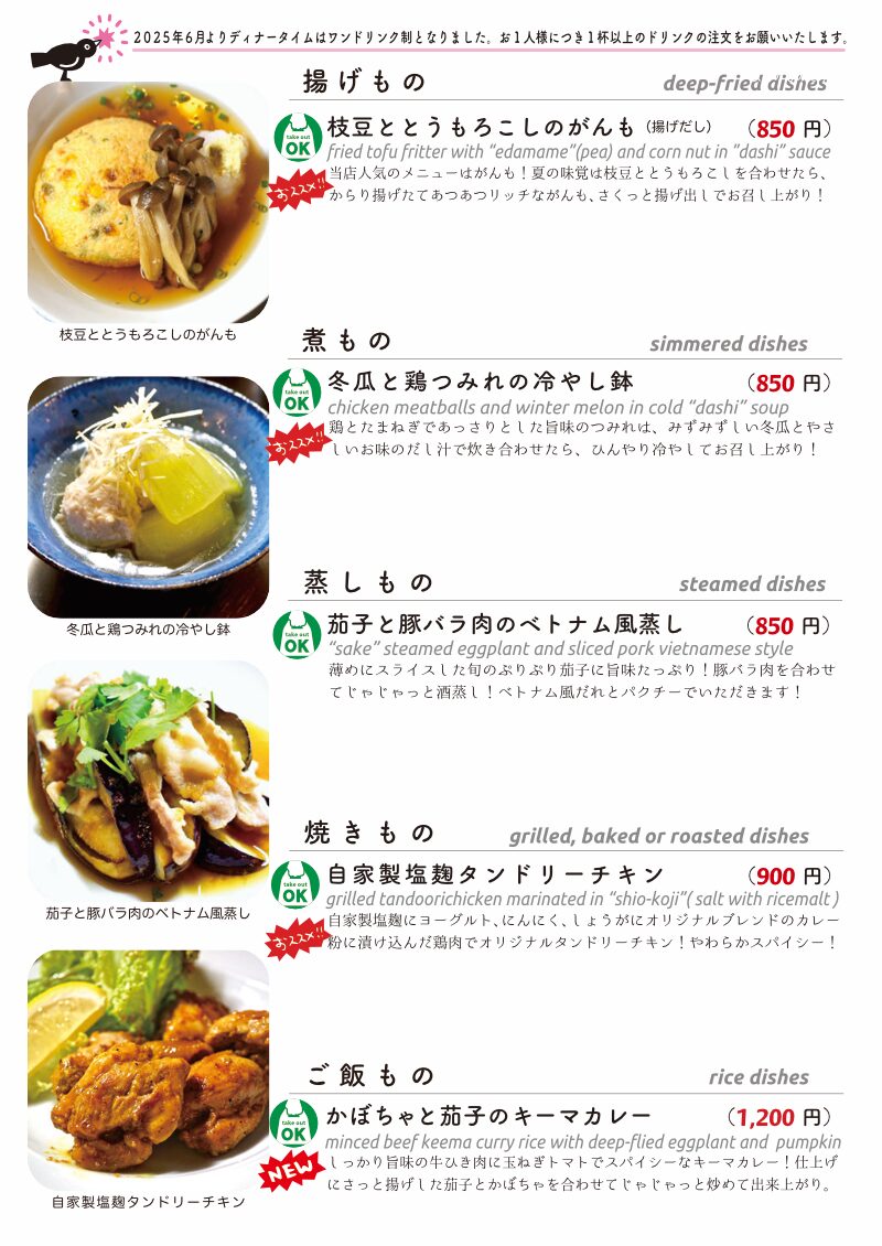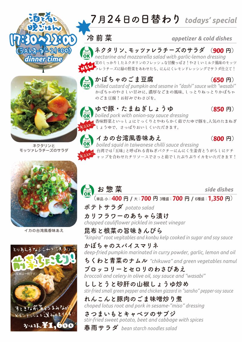 今夜もおいしいごはんは日替わりに、もちろんお持ち帰りも!