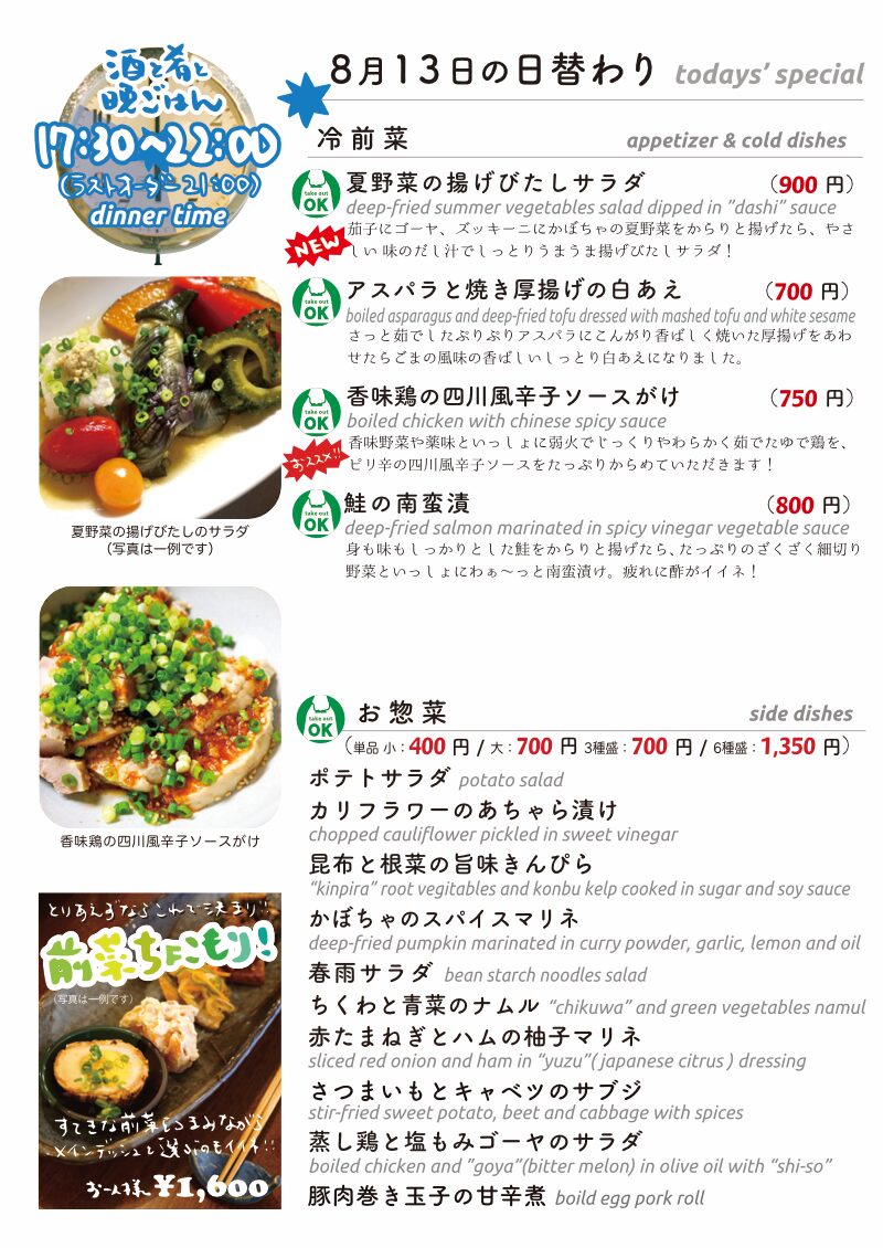 今夜もおいしいごはんは日替わりに、もちろんお持ち帰りも!