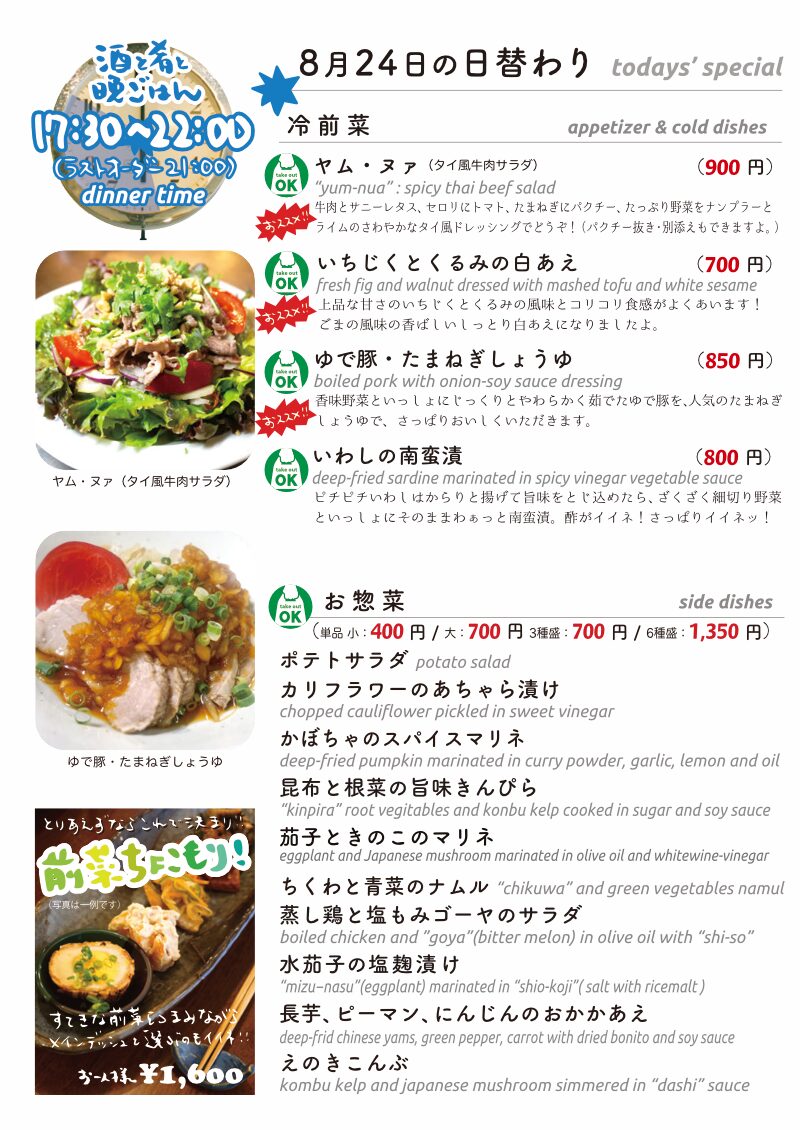 いや東京三鷹も本日の最高気温は38℃とうだるような暑さでしたねぇと日曜日の夜…と、お昼に午後はSNSと今日のご予約は少なめですよ〜とお知らせしましたが、夕方ちょこちょこご予約も入ってさてと当店只今ご案内出来るお席は?…今夜の日替わりにお持ち帰りも!