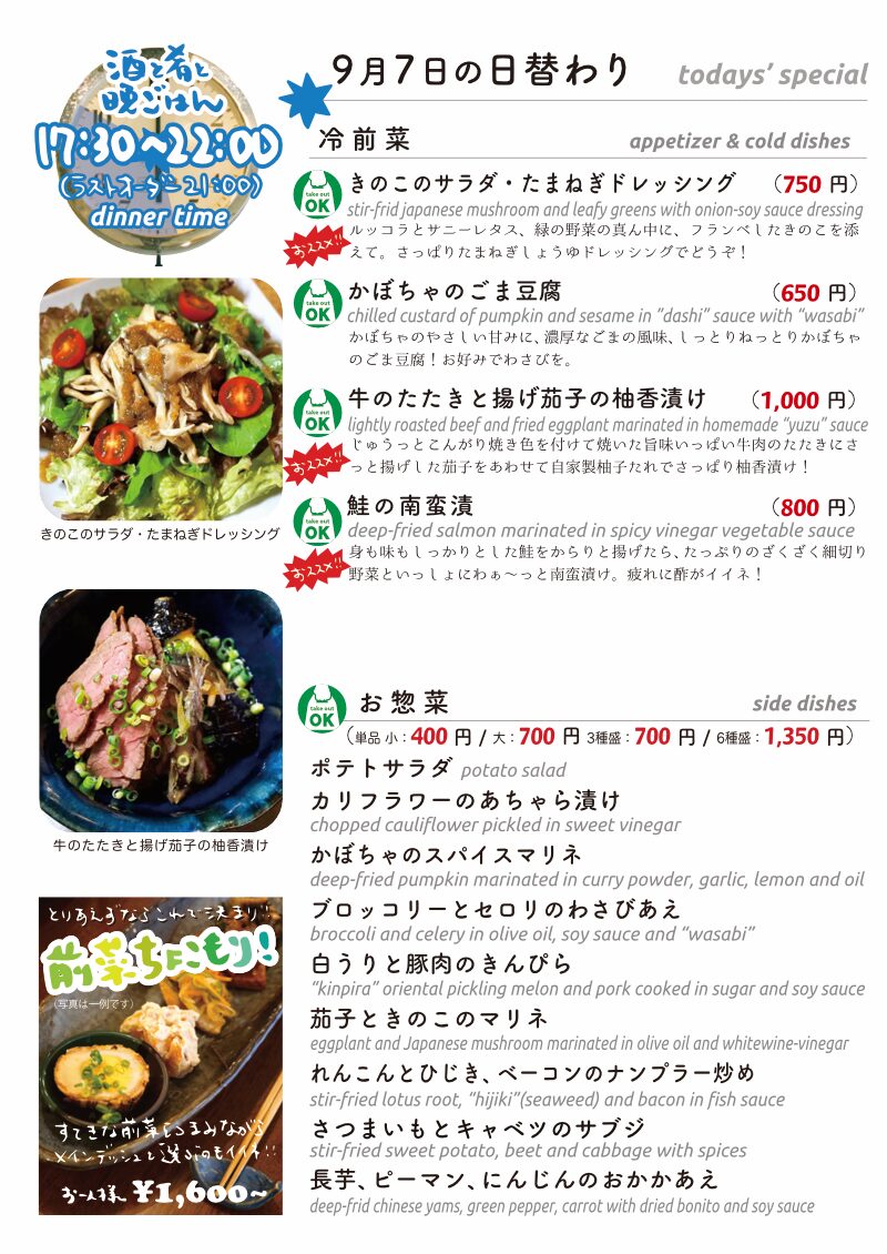 さてさて暑くはあったけれど気持ちのいいお天気でしたね〜…って、いや、みなさん今日はお出かけとかされた方も多かったのでは?なんて思いつつ(いや、ちょっとお昼時のんびり目でしたしね)日曜日、しかし明日はまた35℃越えの猛暑日予報なのだけれど、残暑の激しさももうこのくらいにしておいていただきたいものですねとか思いつつ、夜ものんびりスタートしておりますよ、えぇ、よろしかったら日曜日の〆ごはん!ぜひぜひご来店下さいませ〜★(ナニトゾなにとぞ)