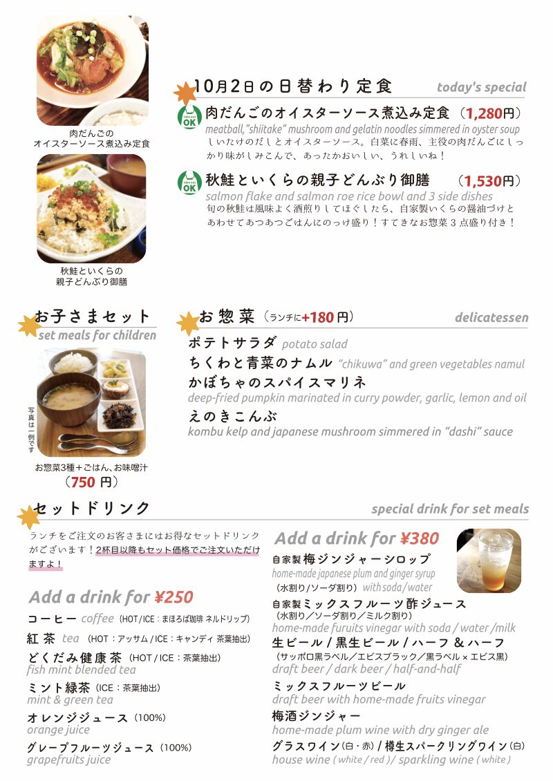 いやいやさわやかな秋風に、薄ーくうろこ雲も広がって完璧なからりと秋晴れで東京三鷹は木曜日もお昼時…って、ワタクシ実はこのスバラシイ秋晴れをとてもうれしく思っているのは、つまり先日定休日にちらりとウッカリで(苦笑)…今日のお昼ごはんにお持ち帰り日替わりですよ