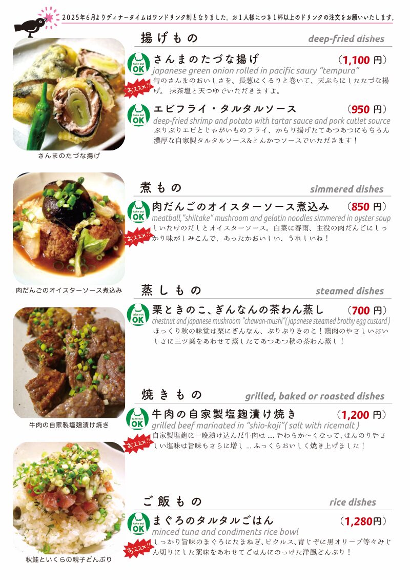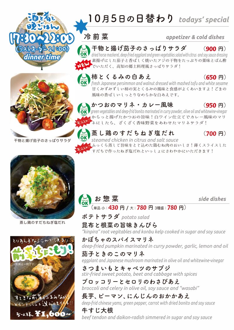今夜もおいしいごはんは日替わりに、もちろんお持ち帰りも!