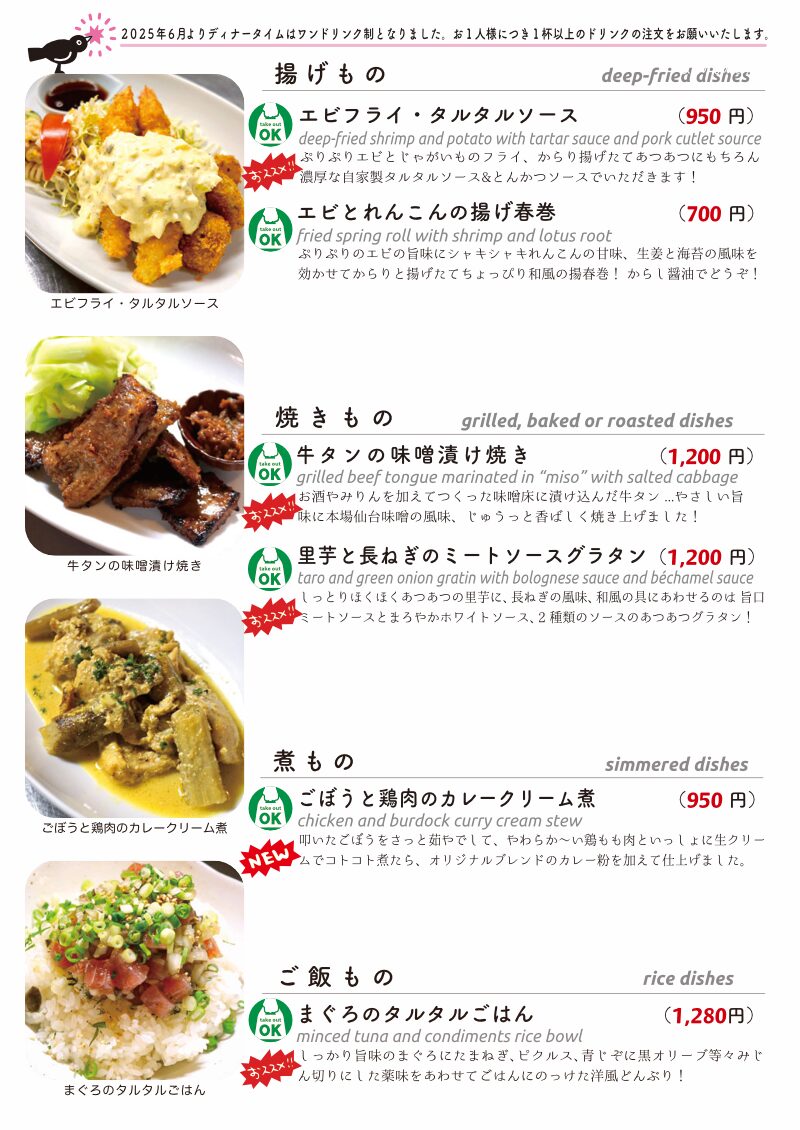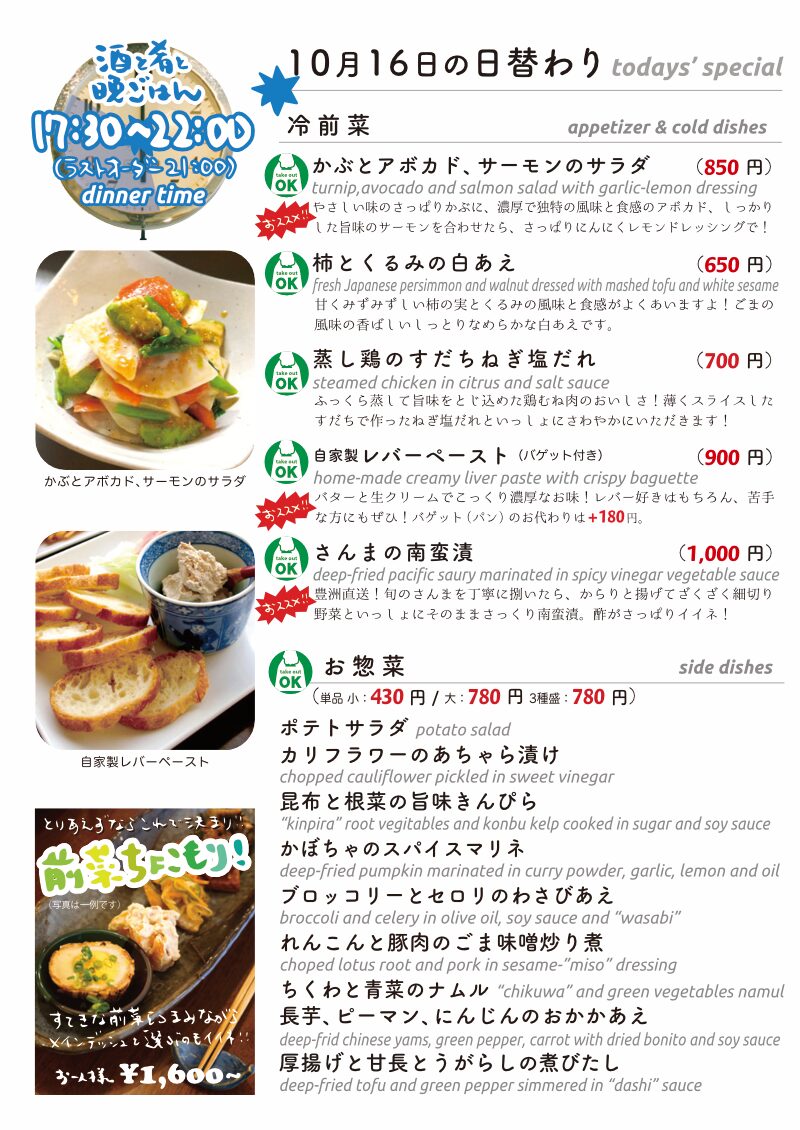 今夜もおいしいごはんは日替わりに、もちろんお持ち帰りも!