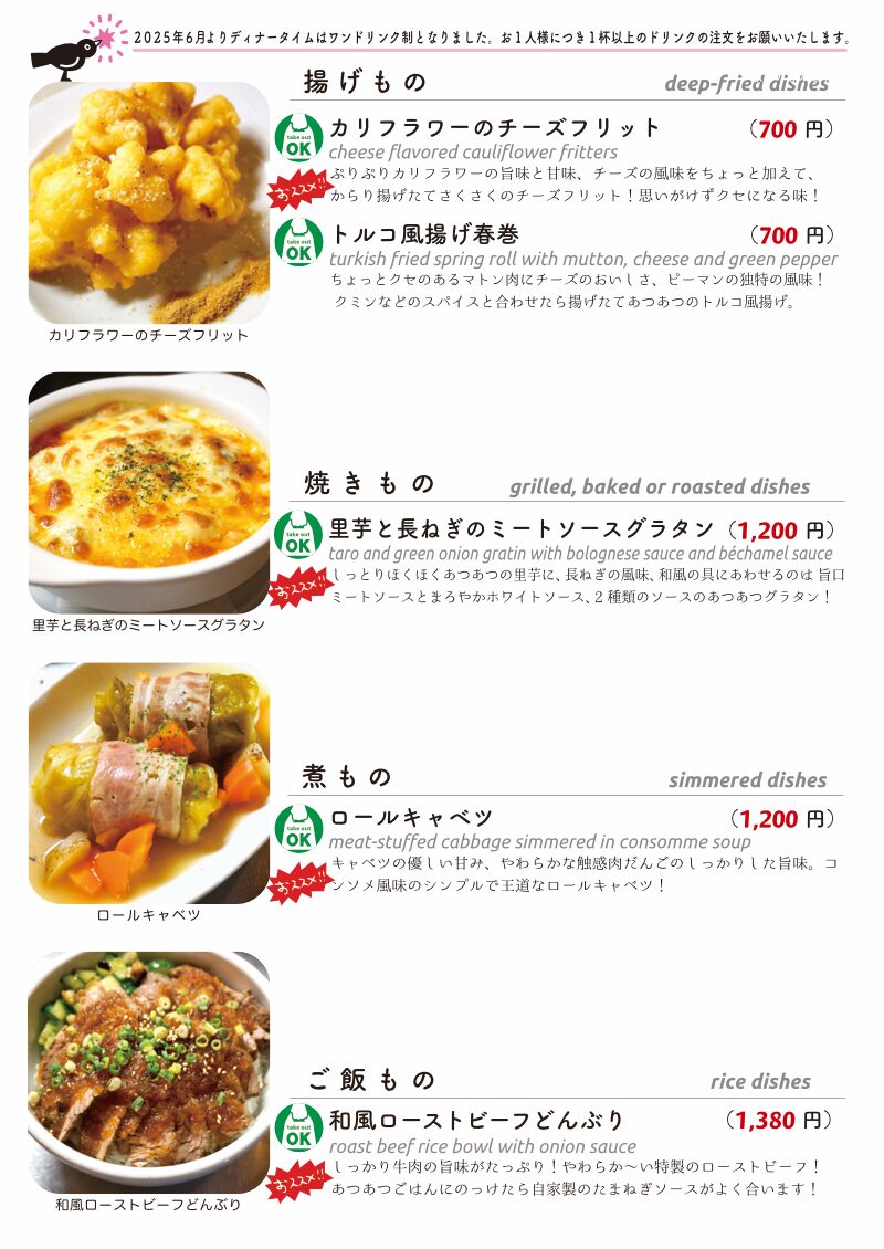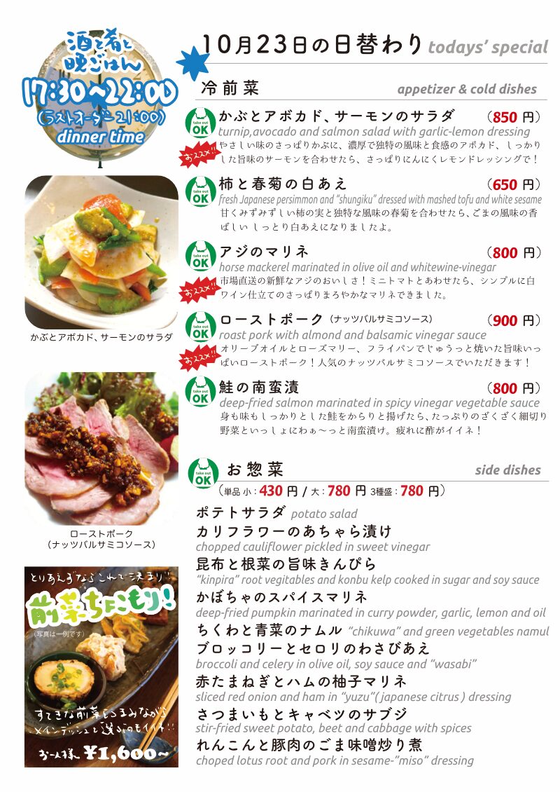 今夜もおいしいごはんは日替わりに、もちろんお持ち帰りも!