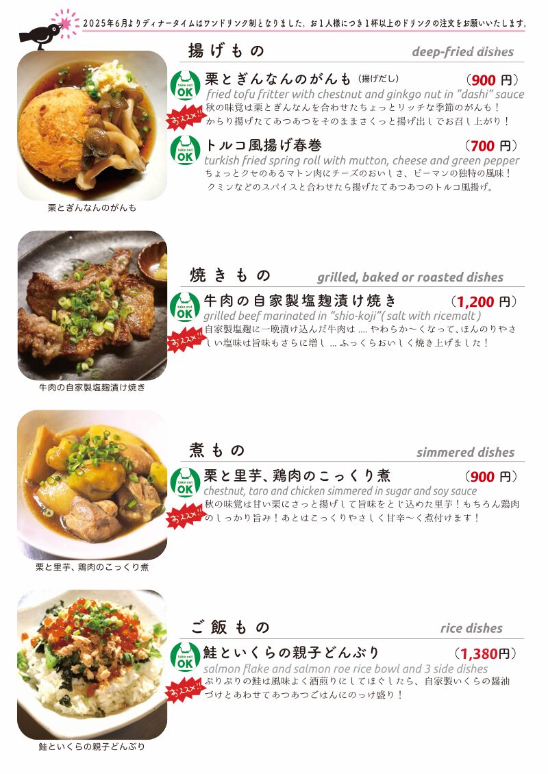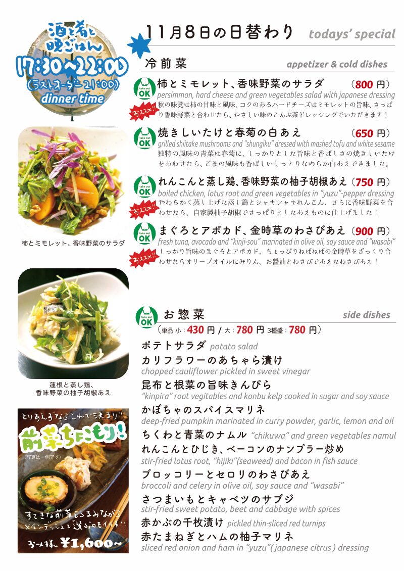 今夜もおいしいごはんは日替わりに、もちろんお持ち帰りも!