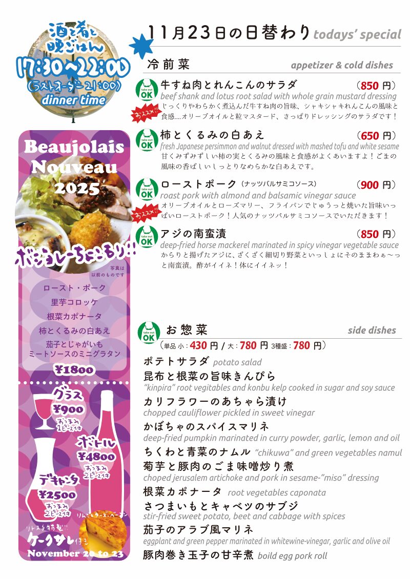 いや、勤労感謝の祝日3連休は中日の日曜日…毎秋恒例星マルシェはこれがなかなかの大盛り上がり!と、しかし夜はいよいよ当店今年の秋の葡萄酒新酒祭りはボジョレー最終日!そして明日から秋休みもいただきますよと申し上げつつ…今夜の日替わりにお持ち帰りも!