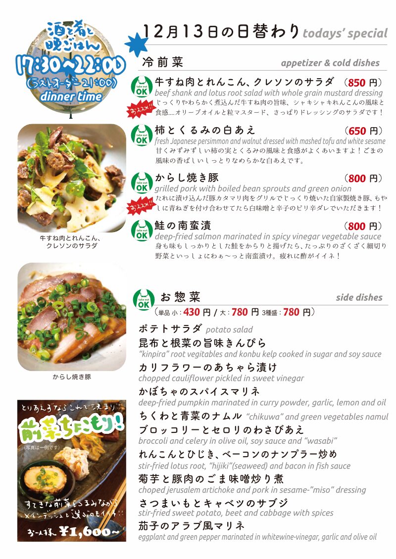 さてさて東京三鷹はすっかり暮れてお天気はこれから下り坂です土曜日の夜…って、そんな今夜の当店ありがたいことに只今満席御礼、ご来店ならちょっと遅めの時間、お電話してからが吉です!(スミマセン)今夜の日替わりにお持ち帰りも!