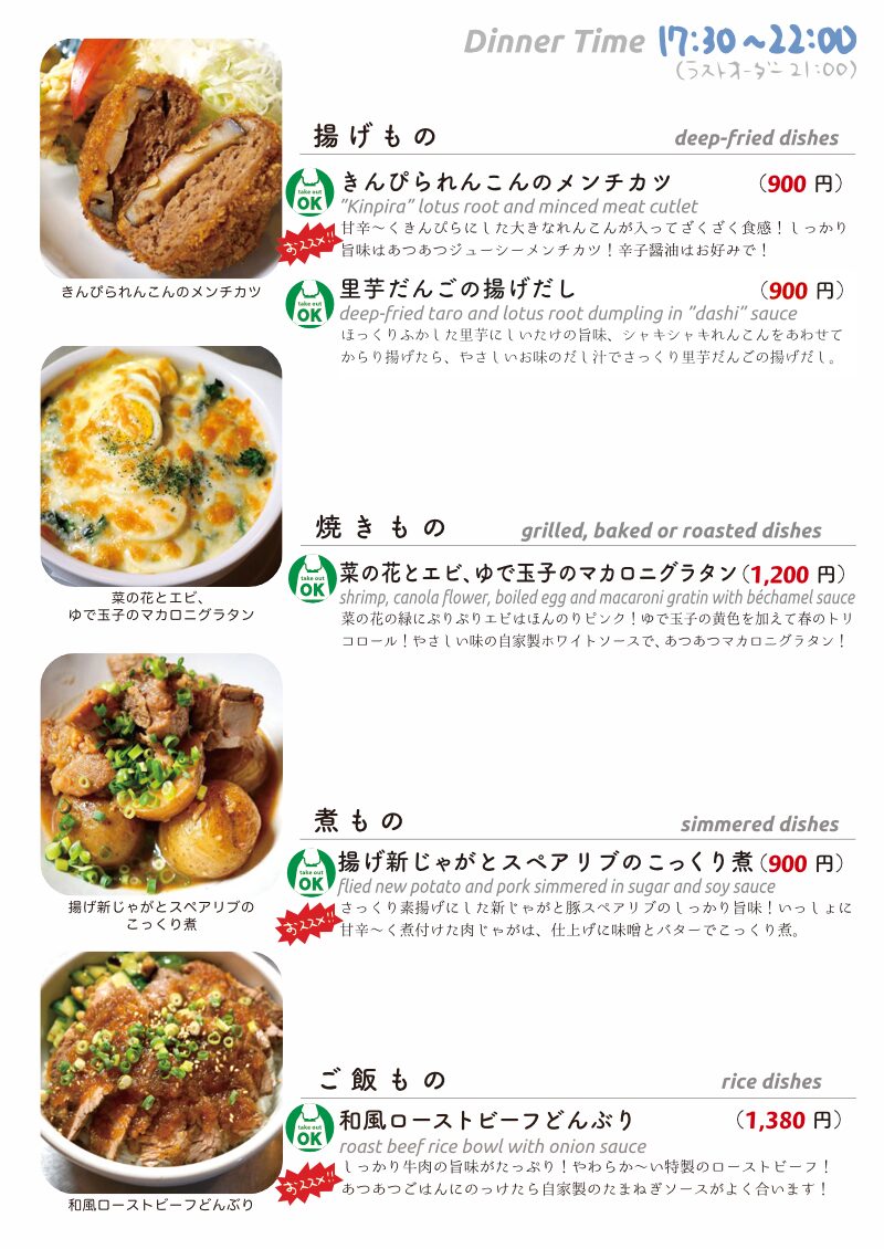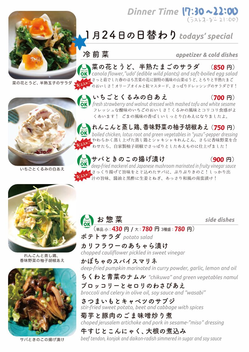 今夜もおいしいごはんは日替わりに、もちろんお持ち帰りも!