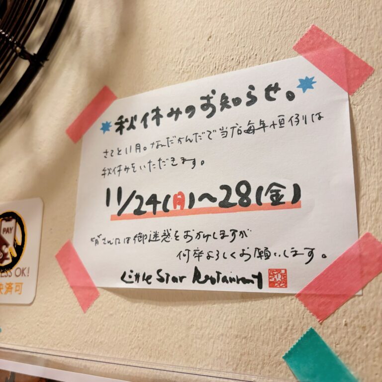 さてと11月も半ばに入って寒くもなってまいりましたねと、いや、当店毎年この11月はちらりと秋休みをいただいております。 今年はボジョレーの週末が終わった勤労感謝の日の3連休最終日の24日は月曜日から金曜日まで…(お)