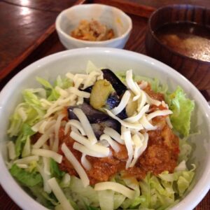今日のまかないは「なすのサンドフライ定食」です。3日ぶりのまかないです。ウチの息子はナスはどうしても食べれないと言うのでナス料理は作りません。こんなに美味しいのに食べれなくてかわいそう。(い)
