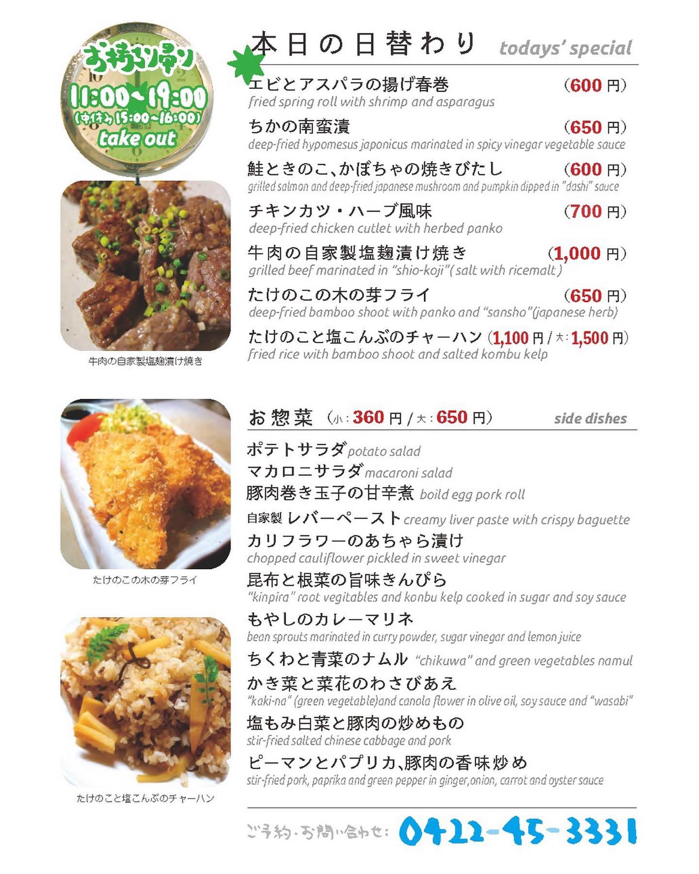 さてといよいよ明日から当店はお持ち帰り専門店として再スタート!と、はじめてみなけりゃわからないことばかりでしょうが、ひとまずたたき台的にメニュー等作ってみました!