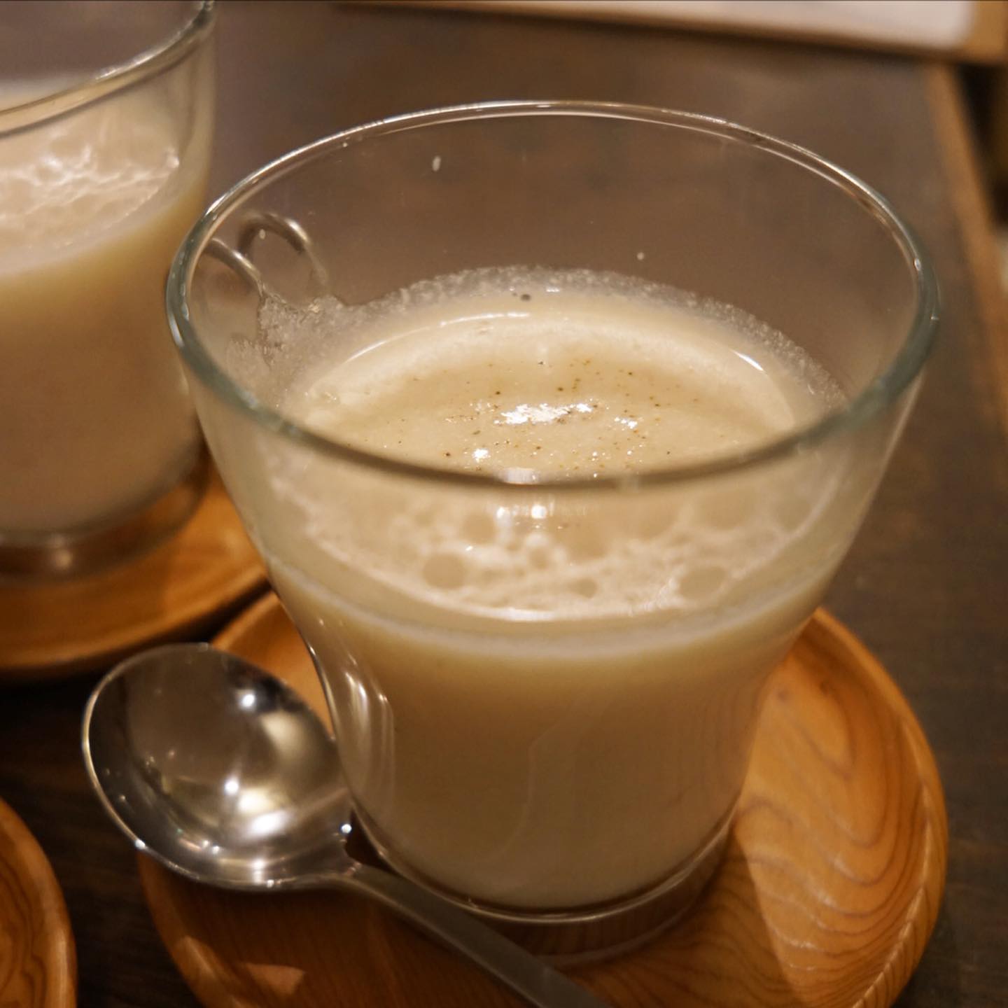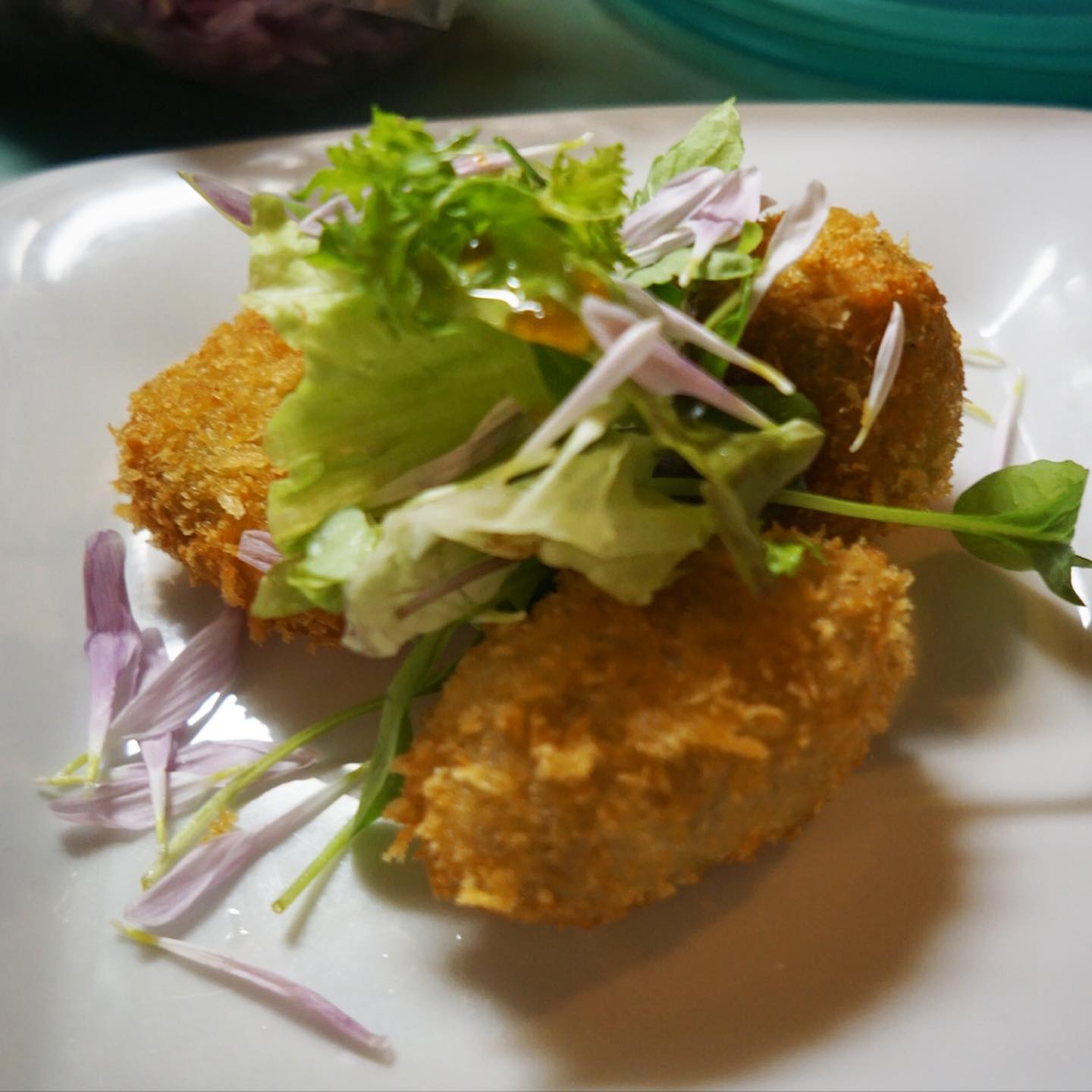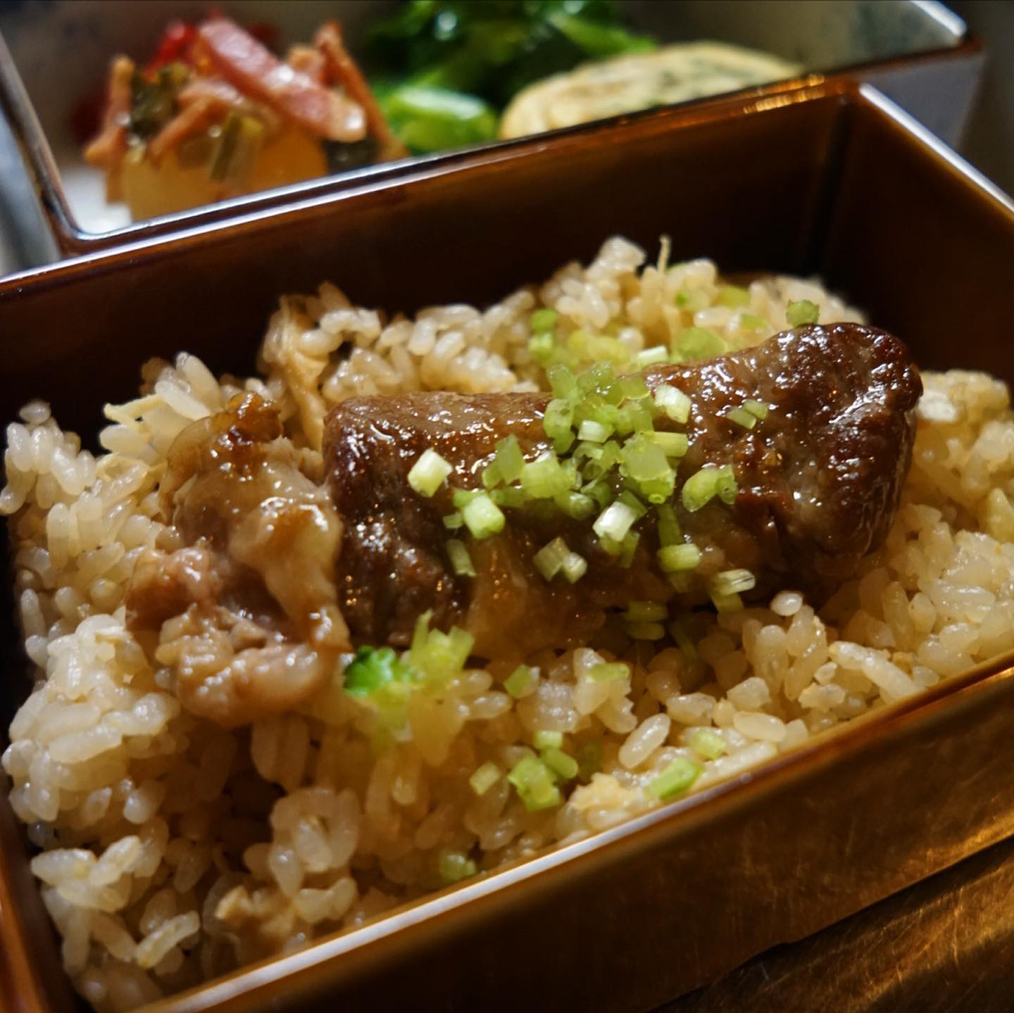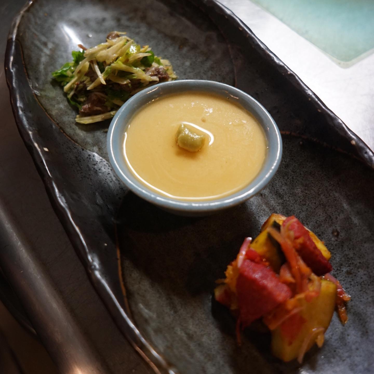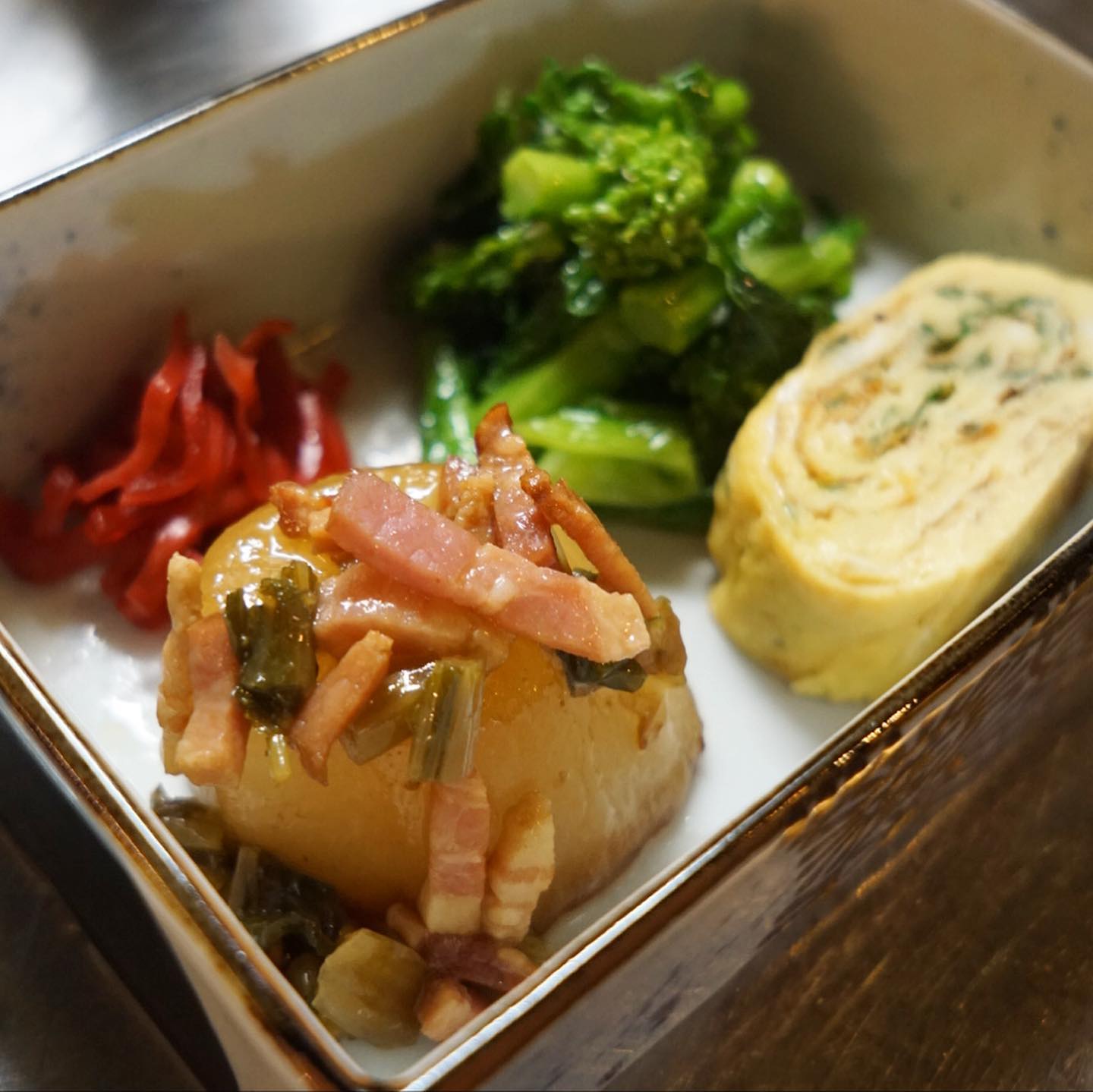 さてと今年もなんだかんだ盛り上がったね!大好評御礼はクリスマスディナー!ラインナップをアップしておきましょうか!と、付出は「自家製オイルサーディンのケークサレ」はホールでどーんと(笑)、前菜ちょこもりは「彩り野菜のスパイスマリネ/牛すね肉とセロリのサラダ/自家製ごま豆腐」、スープは今年も人気でした!「かぶのポタージュ」、温菜はちょっとピンぼけ(苦笑)「3種類のコロッケ…ブロッコリのポルペッテ/里芋とエビのコロッケ/フィッシュスパイスコロッケ」、主菜はお弁当元年の今年にふさわしく「牛肩ロースのやわらか角煮・炊き込みごはんお弁当仕立て」!…って、あ!デザートの「バナナカルダモンアイスクリームのパフェ」は撮り忘れた!(苦笑)しまった!(お)