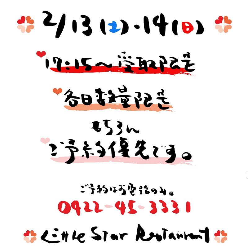 さてと遅くなりましたが、今週末はバレンタイン!と、相変わらずのコロナ禍は超時短営業の昨今ですので、お持ち帰りでおうちバレンタインがいいかもね?!と、ご予約はお電話でお願いします〜!(お) 投稿日 2021年2月11日 更新日 2024年1月2日 著者 okayan カテゴリー single さてと遅くなりましたが、今週末はバレンタイン!と、相変わらずのコロナ禍は超時短営業の昨今ですので、お持ち帰りでおうちバレンタインがいいかもね?!と、ご予約はお電話でお願いします〜!(お)