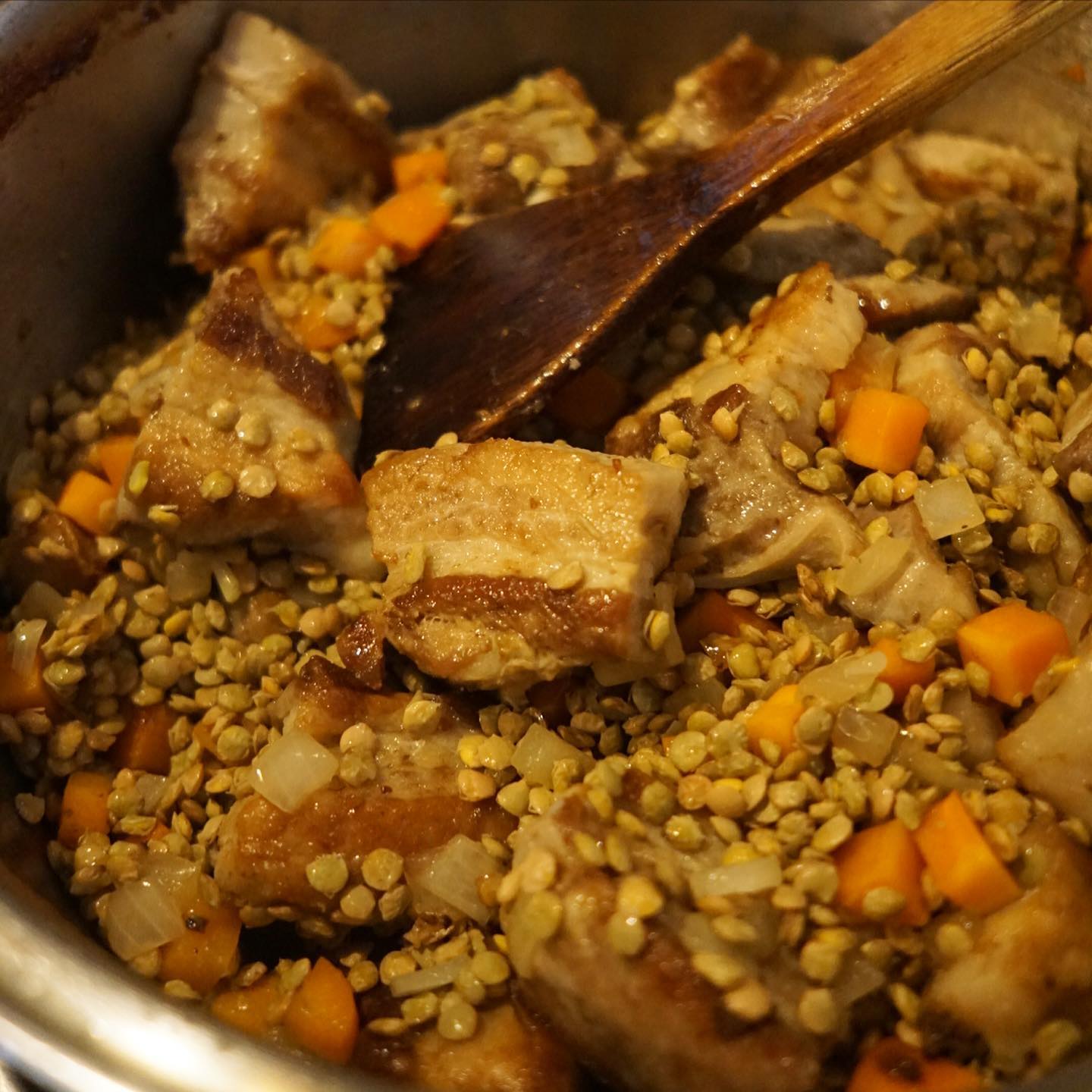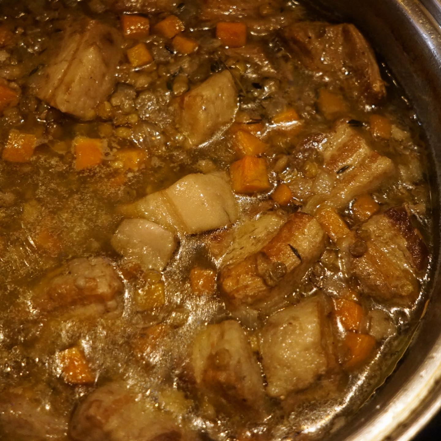 一度オイルでやわらか〜く低温煮込みした豚バラ肉は余分な油を落としがてらじゅうっとやいたら、レンズ豆ににんじん、たまねぎのみじん切りとあわせて、タイムといっしょに煮込みますよ!と、えぇ、絵的には実に地味ではありますが、これが旨味満点!「豚のコンフィとレンズ豆の煮込み」!ぜひ〜!(お) 投稿日 2021年5月1日 更新日 2024年1月2日 著者 okayan カテゴリー single 一度オイルでやわらか〜く低温煮込みした豚バラ肉は余分な油を落としがてらじゅうっとやいたら、レンズ豆ににんじん、たまねぎのみじん切りとあわせて、タイムといっしょに煮込みますよ!と、えぇ、絵的には実に地味ではありますが、これが旨味満点!「豚のコンフィとレンズ豆の煮込み」!ぜひ〜!(お)