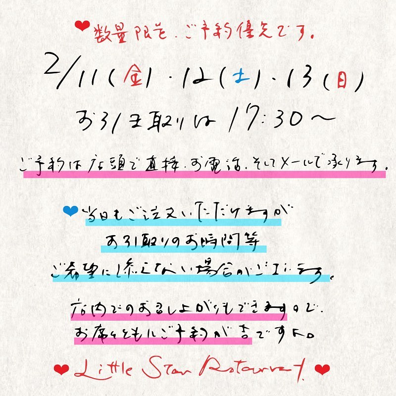 さてと今年のバレンタインは当店定休日の月曜ということで、建国記念日の祝日がらみの今週末3連休開催!「バレンタインちょこもり」!もちろん引き続きのコロナ禍はマンボウ期間中はお持ち帰りに、だから逆にソーシャルディスタンス?な店内ご飲食もあわせてご予約スタートです! 今回も数量限定はご予約優先、直接店頭でご予約のほかはお電話(0422-45-3331)にメール(info@little-star.ws)でご予約いただけます…インスタならプロフィールの[問い合わせ]から電話もメールも出来ますよ!(お引取り日時とお電話番号を明記して下さいね)。