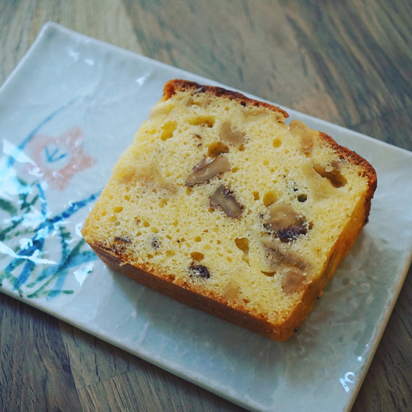 パウンドケーキは「リンゴジャムとクルミ」となりました。紅玉で作った赤みを帯びたジャムは甘さ控えめ。たっぷりクルミと合わせたら、王道のおいしさです。