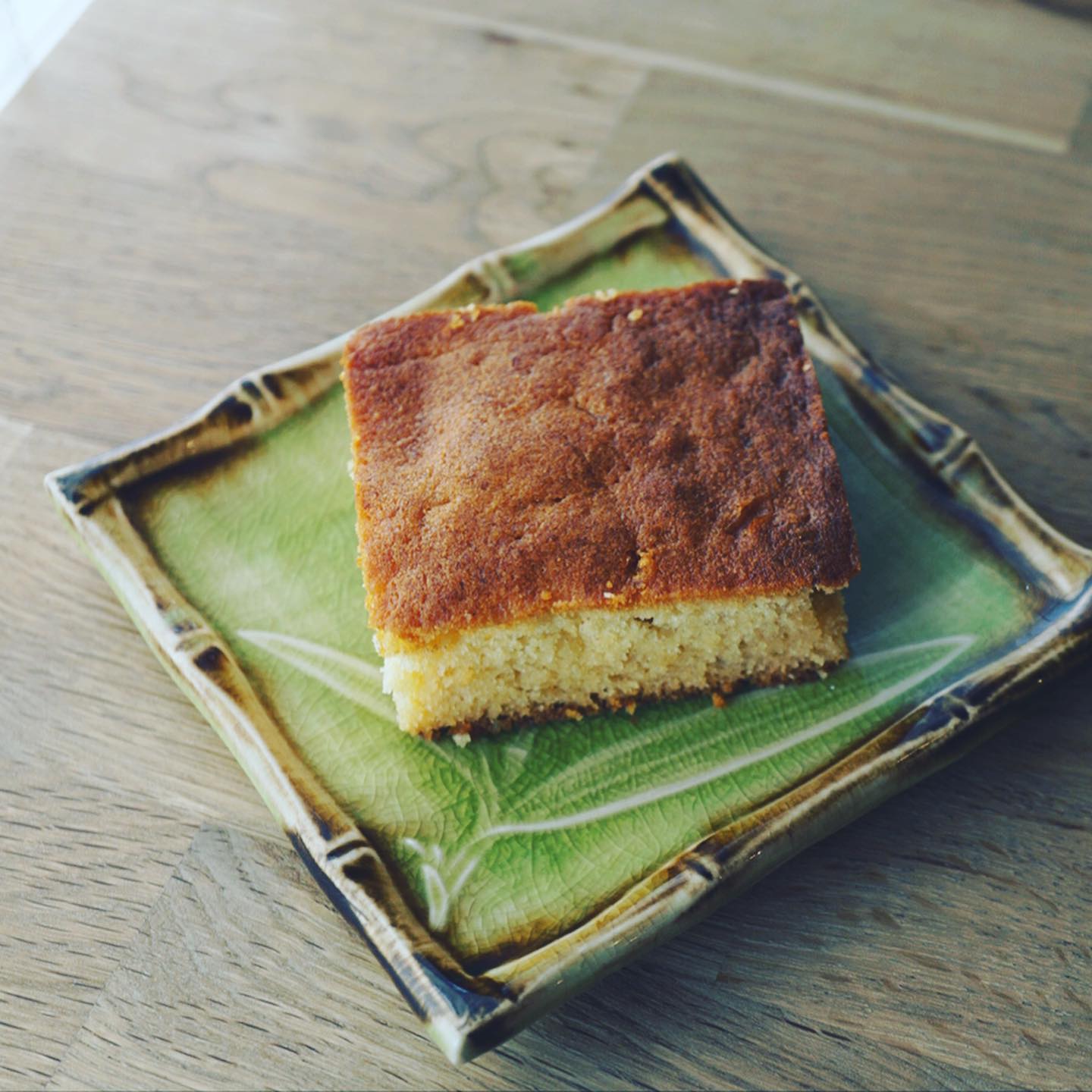 さらには、新しょうがとハチミツのケーキ。高知・森田農園さんから直送の新生姜をハチミツ煮にしてたっぷり混ぜ込みました!底にはザラメをひいて、食感に変化をつけてます!和菓子みたいな雰囲気のケーキです。