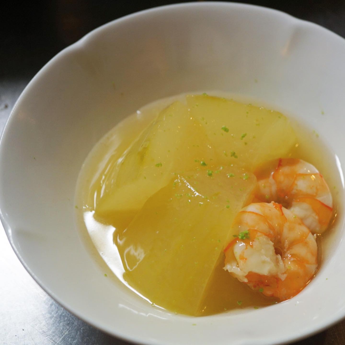 新メニューは煮物2種。「冬瓜と海老の炊き合わせ」は、お出汁と海老の旨みを冬瓜に含ませた、お腹にも気持ちにも優しい一品。青柚子をすりおろして香り豊かにいただきます。