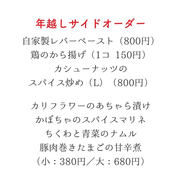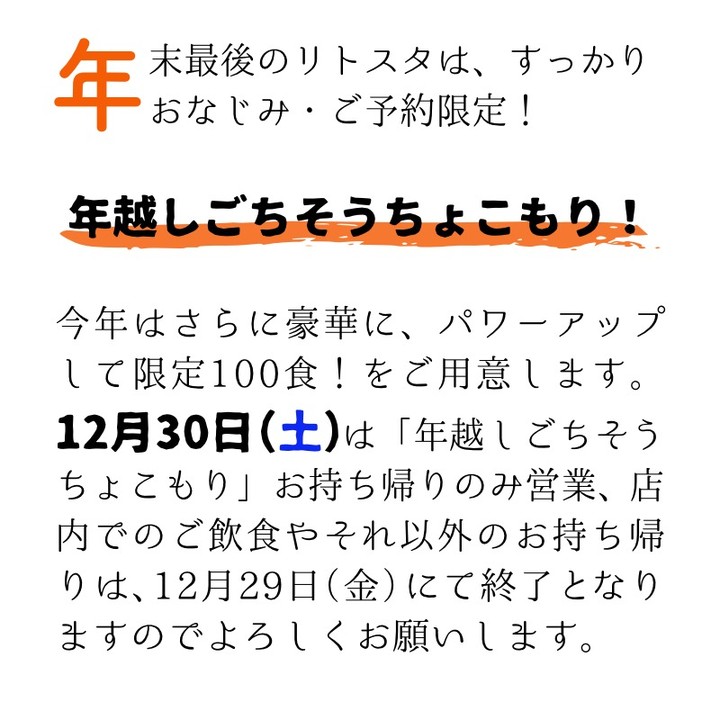 さてと当店今週はいよいよクリスマスディナーではありますが、今年も年末最終日の12月30日(土)はすでに恒例! 年越しごちそうちょこもり!