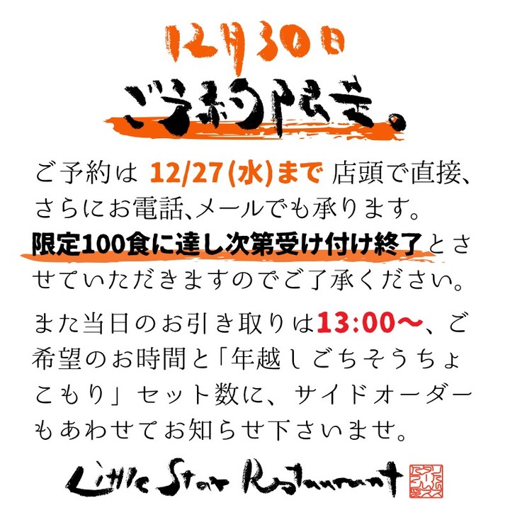 お引取りは13:00〜、もちろんご予約限定さらに今年は限定100食となります! と、そのご予約、〆切は27日(水)いっぱい、店頭で直接、またはお電話(0422-45-3331)、そしてメールでも承ります。お電話番号「年越しごちそうちょこもり予約」と明記してinfo@little-star.wsまで、お電話番号にお引き取り希望時間も忘れずにお願いします…返事が来ないようでしたら届いてない可能性もありますので、その時は申し訳ありませんがお電話下さいませ。
