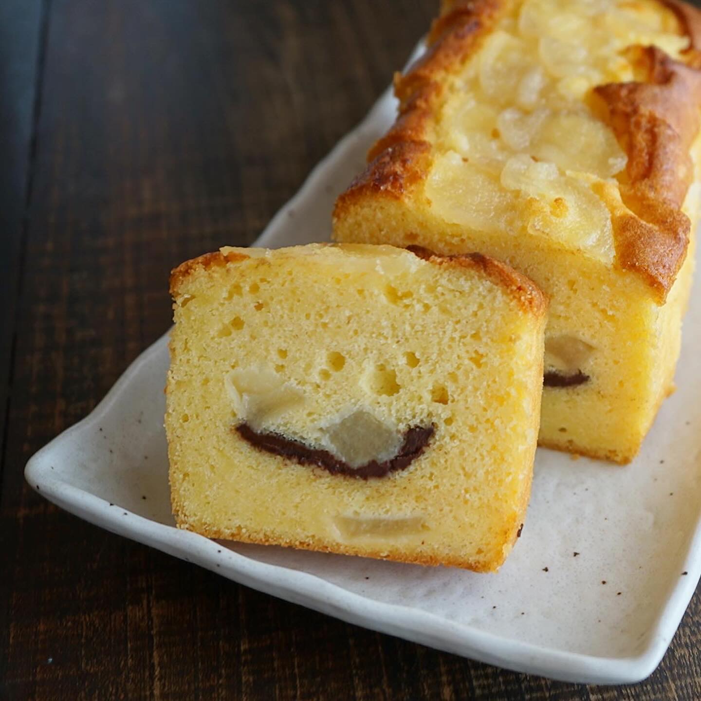 これまた定番パウンドケーキは、「和梨のコンポートと板チョコ」です。生姜とブラックペッパーの風味を足した白ワインベースの和梨のコンポート、この和梨は兵庫のおかだ農園さんの梨をお客様で友人のヤマトくんが送ってくれたもの。板チョコを入れて焼いたら、表情の可愛いパウンドケーキになりました!