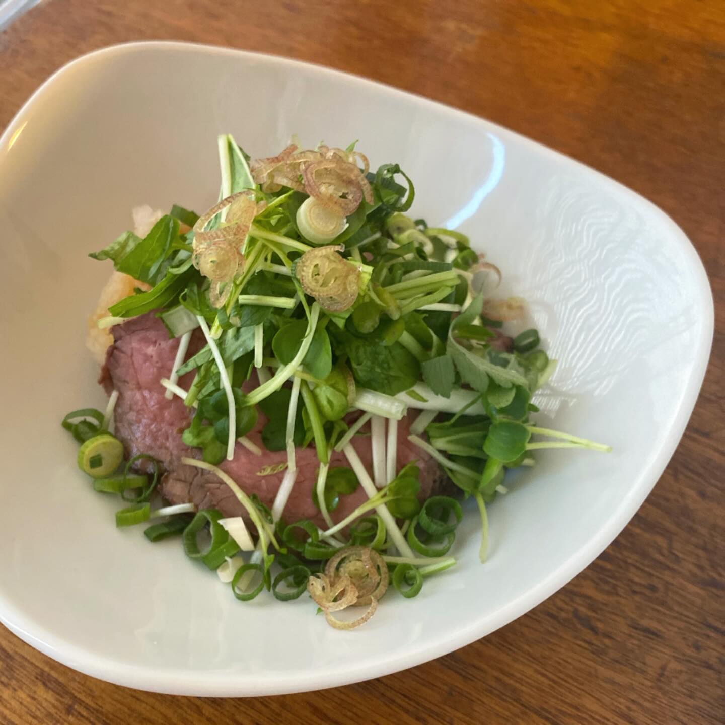 お肉の前菜は、牛のたたき・自家製おろしぽん酢でさっぱりと。赤身ですっきりとした美味しさの牛のうちもも肉を炙ったら、柚子果汁たっぷりの自家製ぽん酢でいただきます。たっぷりの香味野菜がヘルシーですよ!(麻)