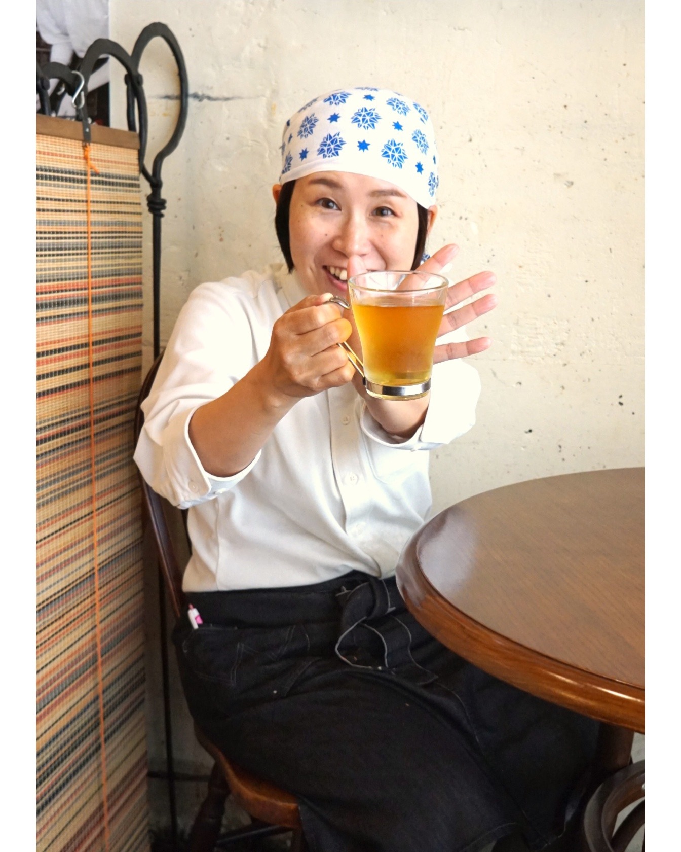 小さな身体だけど、表現力は人一倍!アロマテラピストの横顔を持つママさんスタッフ・シンコさん曰く、「食後はミント緑茶でさっぱりとフィニッシュ!」