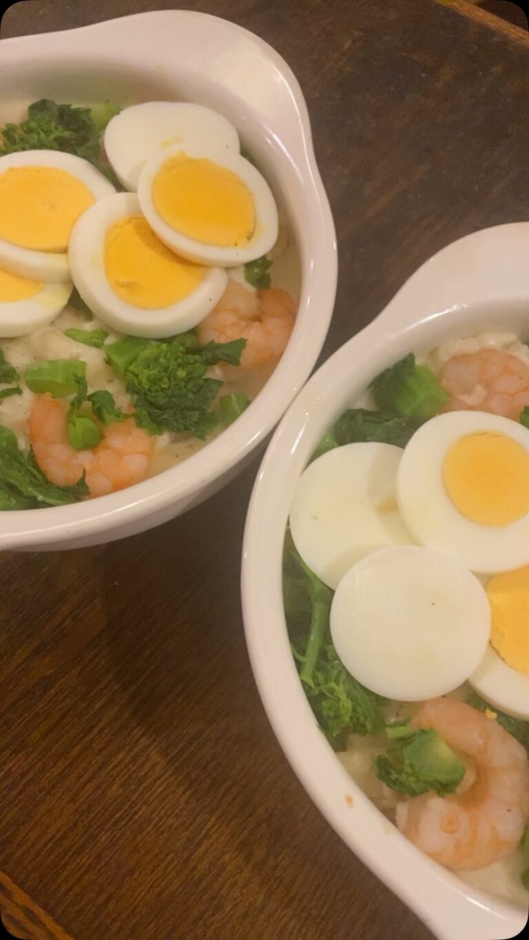 今週はグラタン! 菜の花とエビ、ゆで玉子のマカロニグラタンですよー。店長ミヤザキは大のグラタン好き…中でも王道マカロニグラタンは、春らしい具でまいりますよ!(麻)
