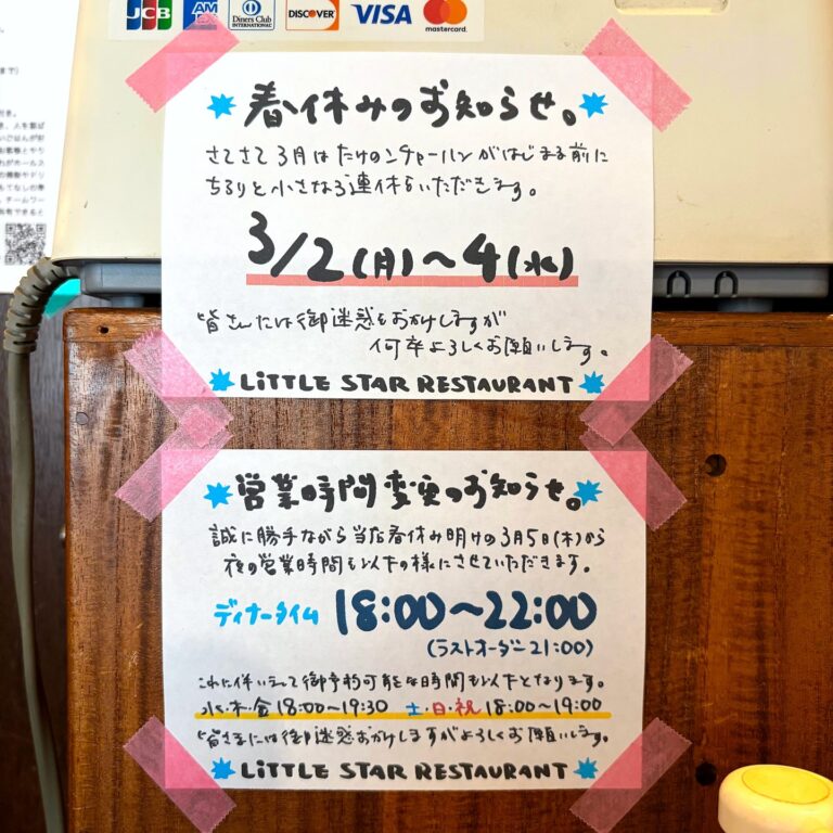 さてさて2月も押し迫ってまいりましたが、ここで来月3月を迎えるにあたり当店からちらりとお知らせがございます。 まずは毎年この時期ちいさな春休みをいただいているのですが、今年は次の定休日にもう一日お休みをていただいて、3月2日(月)〜4日(水)で春休みをいただきます。(お)