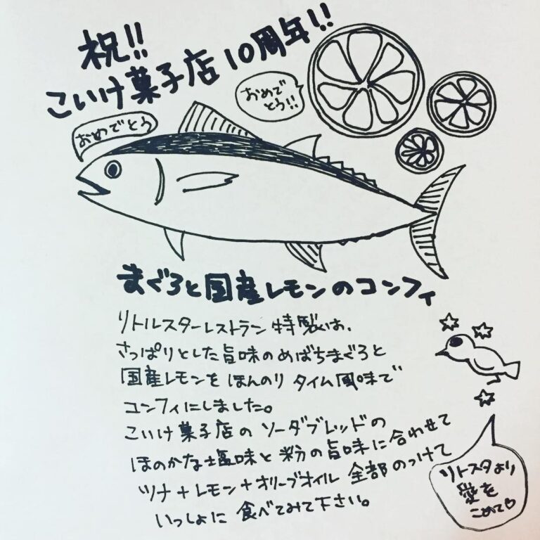 はい、日付変わりまして本日、2月15日金曜日から、こいけ菓子店にてタイアップメニューやらせていただいております! 13日にめでたく10周年を迎えた、こいけ菓子店。知る人ぞ知るリトスタ開店時のオーナーメンバーであり、店長ミヤザキの小学校1年生の時からの友人けいこちゃん@フカザワが営んでおります、質実剛健なお菓子のお店であり、リトスタの焼き菓子を今でも担当してもらっているお店であります。 そんな彼女のお店の10周年を記念したタイアップ企画で、売り切れ御免!10食限定「リトスタ特製まぐろと国産レモンのコンフィと、こいけ菓子店のソーダブレッド」セットが本日から登場します。数が限られている上に、予約、取り置きなどできないようですので、待った無しの早い者勝ち!のようです。リトスタのコンフィは瓶詰めにしてご提供しております。 みなさま、こいけ菓子店へレッツゴー!