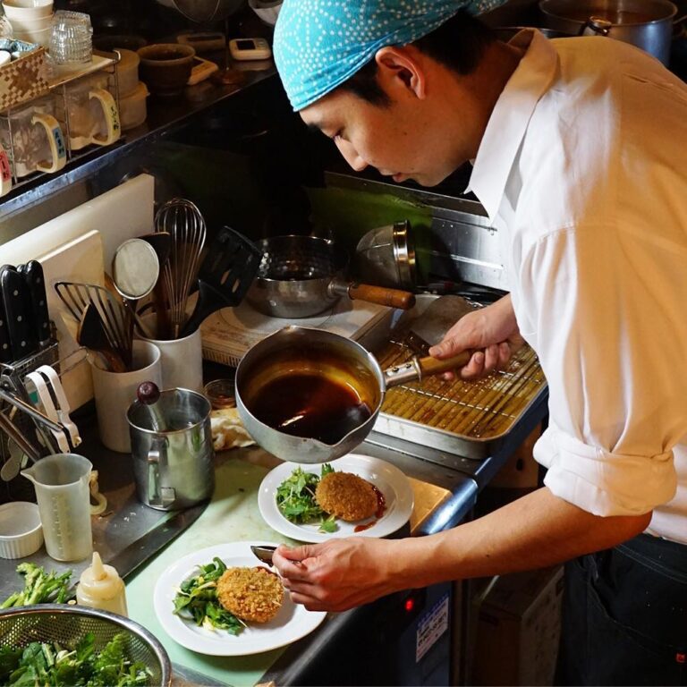 というわけで、その「まぐろと長ねぎのメンチカツ」、キッチンスタッフのナベさんがたれをかけて仕上げているところ!いや、実にイイネ!(笑)(お)