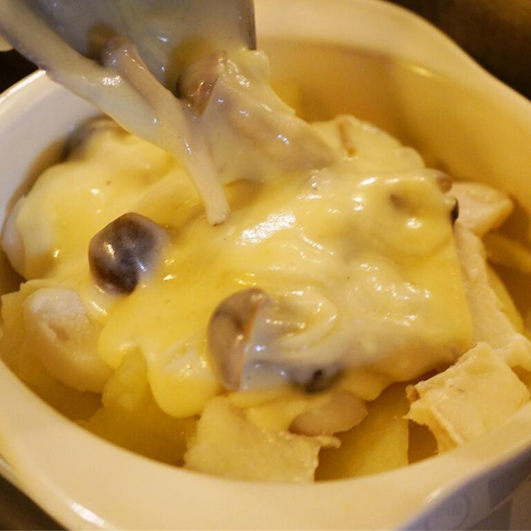 さらにあつあつメニューは新作グラタン!「じゃがいもとたら、きのこのグラタン」!さっくりスライスしたじゃがいもをココット皿に敷きつめたらさっと茹でしたたら!さらにフランベしたきのこと合わせた自家製ホワイトソースをとろ〜りとかけたら、あとはチーズをのっけて焼くだけだい!あつあつをたべるだけだい!(笑)(お)