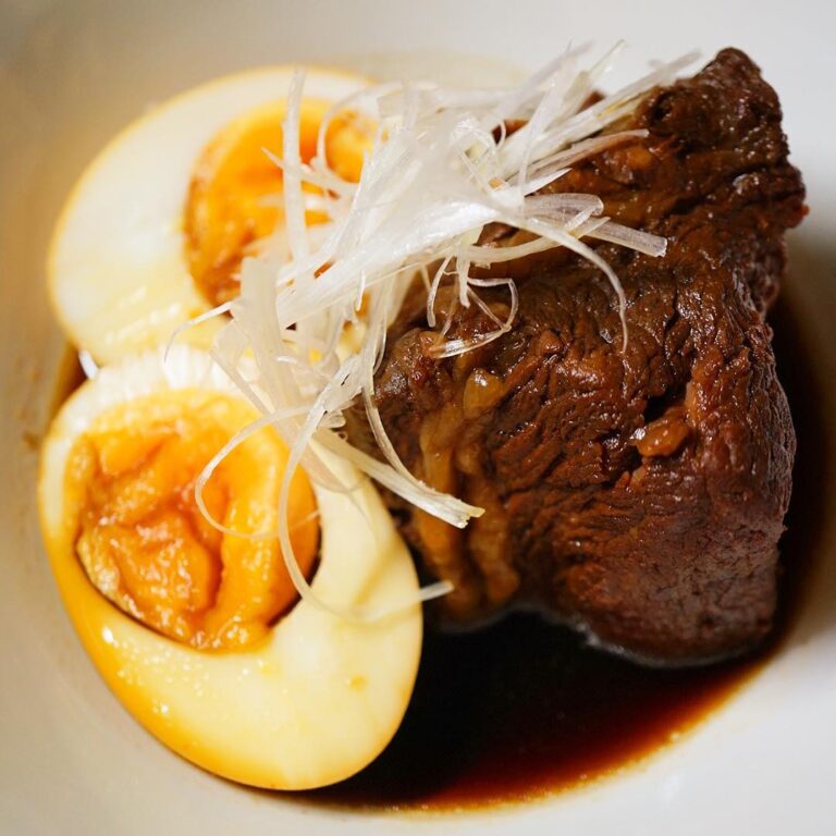 はい、店長ミヤザキの牛肉メニュー特集、今週は牛角煮ですよー!ガッツリ塊肉をジュウと焼いて、3時間煮込んで、一晩おいて…こっくり甘辛煮にしました!半熟煮卵を添えて万全です。 ごはんに、焼酎に、ビールにも!(麻)