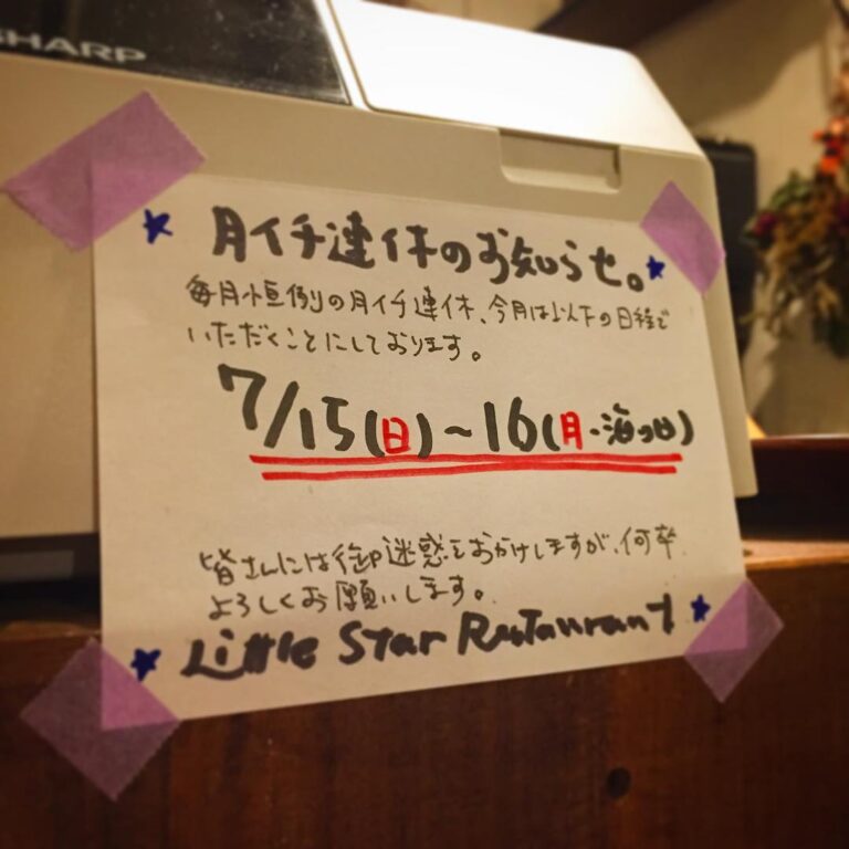 ハイハイ、ということで当店は海の日の三連休は後半日月で恒例の月イチ連休をいただきます。みなさんとは連休明けの17日(火)のランチからまたお目にかかりますね〜!よろしくね〜!(お)