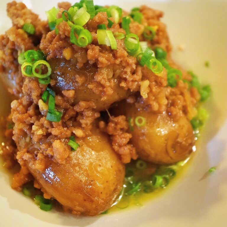 さてとこどもの日の祝日ですなと、今夜の煮ものは新じゃが!さっくり一度揚げした新じゃがにそぼろの旨味!味噌とバターでこっくりこっくり煮付けた春の煮ものですよー!(お)