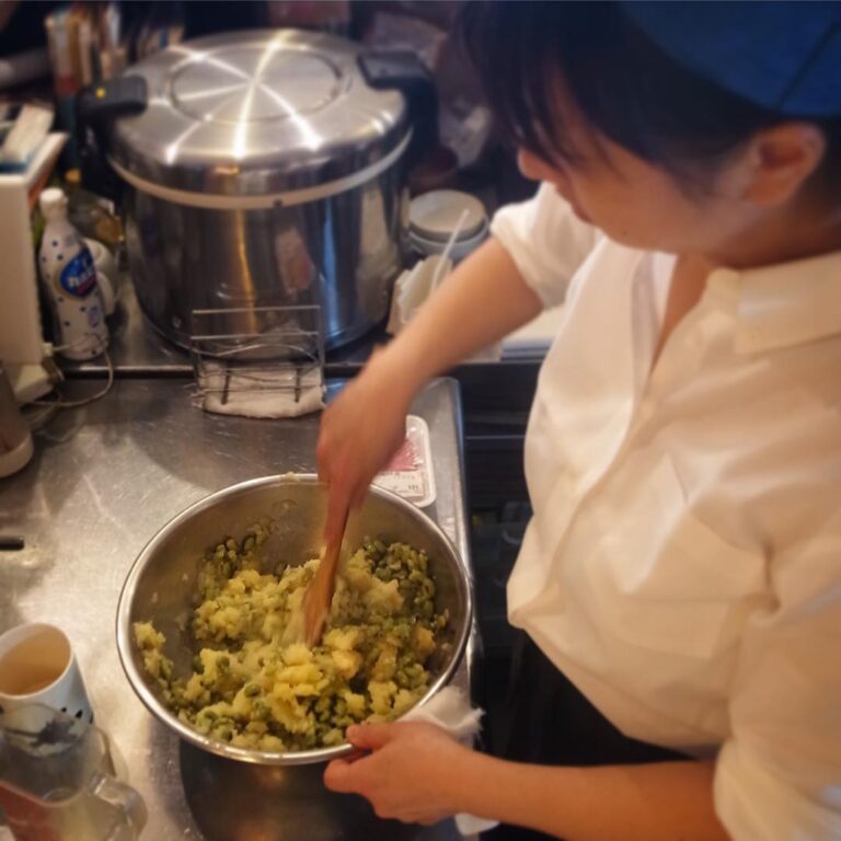さてと今夜の新作メニュー店長ミヤザキ下ごしらえ!と、最近うちで流行りは旨味も風味もアップ!のもどし枝豆にほくほくじゃがいも、このあとハムもあわせてコロッケになりますよ!あー、楽しみだなぁ、ビール…(笑)(お)
