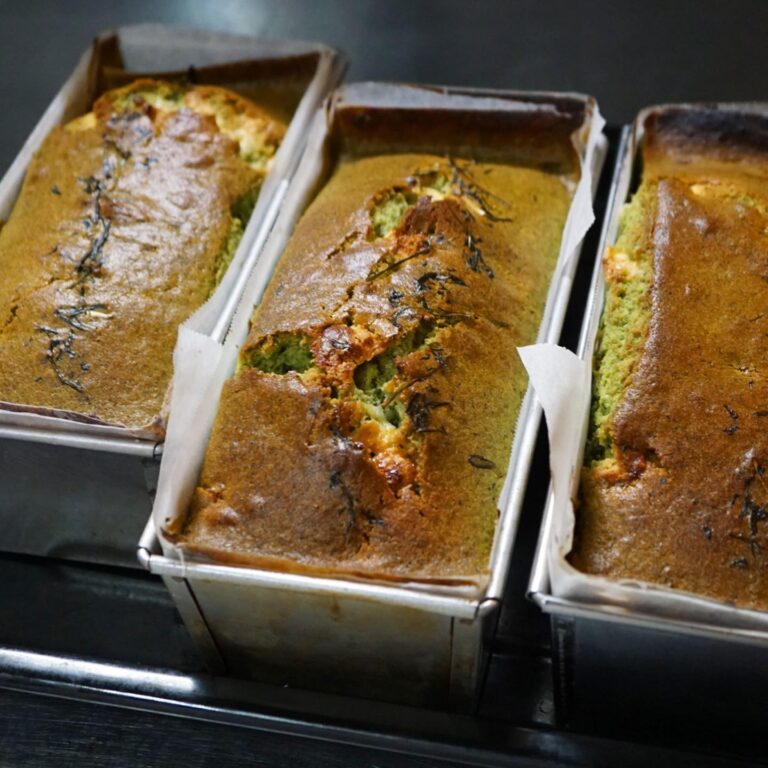 さて、デザートも切り替わっていきますよ! 小さなケーキは「和梨のコンポートとはちみつ生姜のアップサイドダウンケーキ」です。兵庫のおかだ農園さんの梨を、昔馴染みのお客様ヤマトくんが送ってくれました!毎年とても楽しみな美味しい梨を生姜風味の和風コンポートにして、天板に敷き詰め、はちみつと生姜たっぷりの生地と合わせて焼き上げました。 底にあるコンポートをひっくり返して表面に…焼いた上面が下にいくから「アップサイドダウンケーキ」。フルーツを焼き込むのにうってつけのケーキです。ぜひ味を見ていただきたいです! パウンドケーキは「カフェモカ」しっかり苦味のあるコーヒー生地をベースにチョコチップを焼き込みました。コーヒー味のお菓子が好きな店長ミヤザキこだわりの苦味と甘みのハーモニー。こちらもお見逃しなく!(麻)