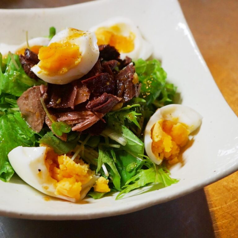 今週のサラダは、自家製ツナと半熟たまご・香味野菜のサラダです〜。ぷりぷりのマグロのアラを見つけたので、塩をして水を出してからハーブと柑橘を入れたオリーブオイルで低温調理…今回はタイムとすだちで爽やかに!みんな大好きニンニクレモンドレッシングで召し上がれ〜(麻)